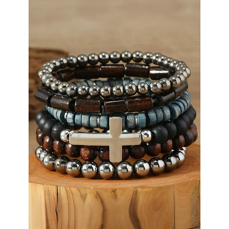 Men's Beaded Bracelet Set with Cross Charm, Multi-Layer Wooden and ...