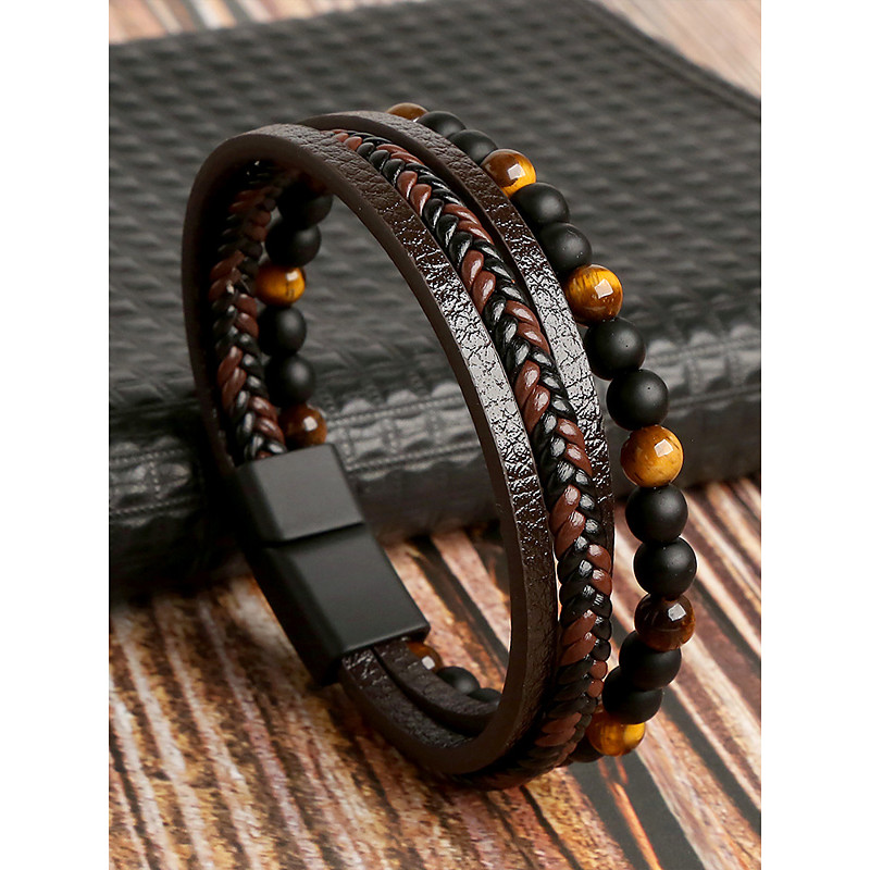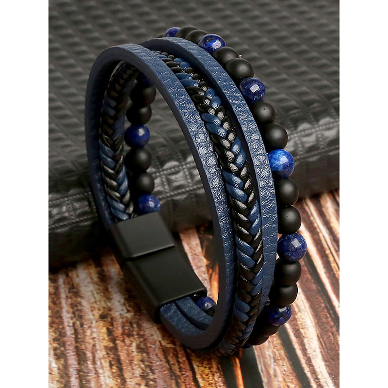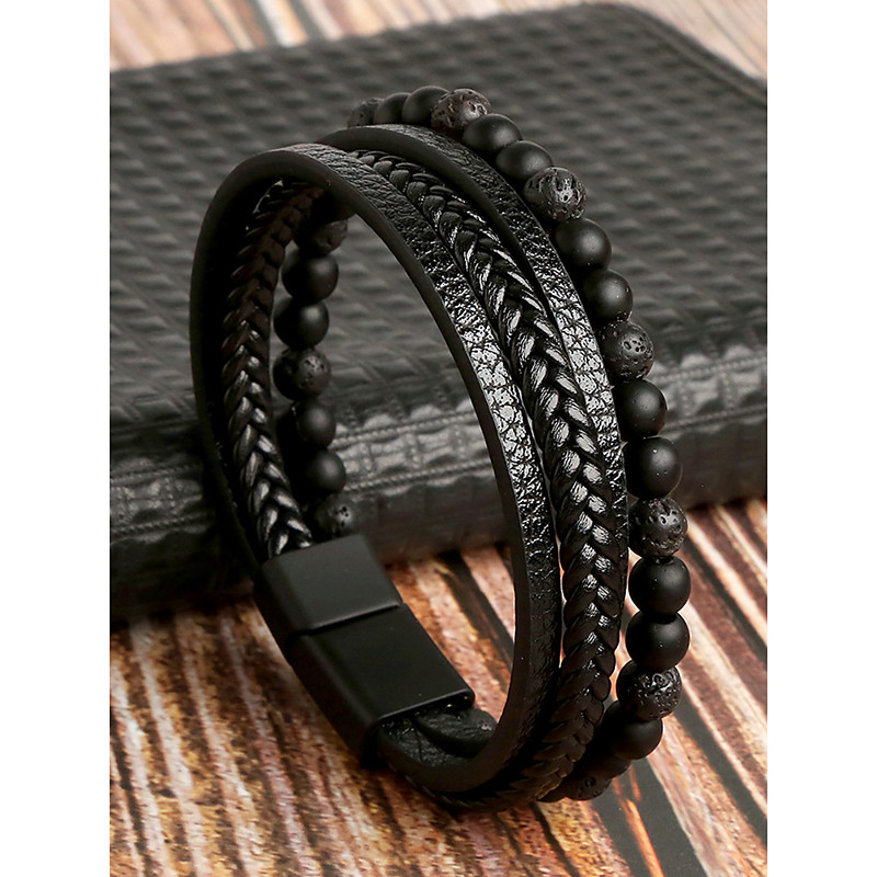 Men's Alloy Faux Leather Beaded Bracelet Set, Multi-Layer Braided W...