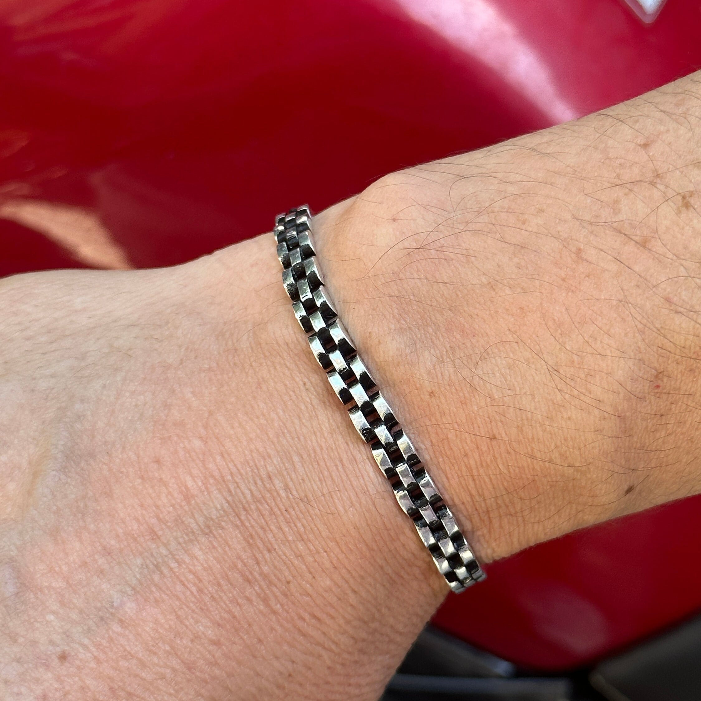 Men Silver Chain Bracelet ,6MM Hand-Engraved Silver Chain Bracelet , Thin Silver Bracelet , Oxide Si...