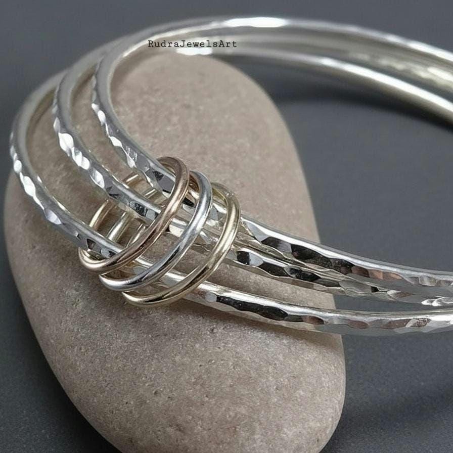 Hammered 925 Sterling Silver Stacking Bangles Set, Mixed Metal Brac...