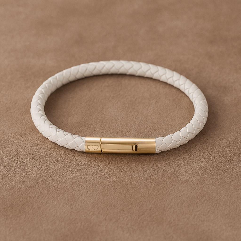 Men's white leather bracelet, personalized men's bracelet, gold buc...