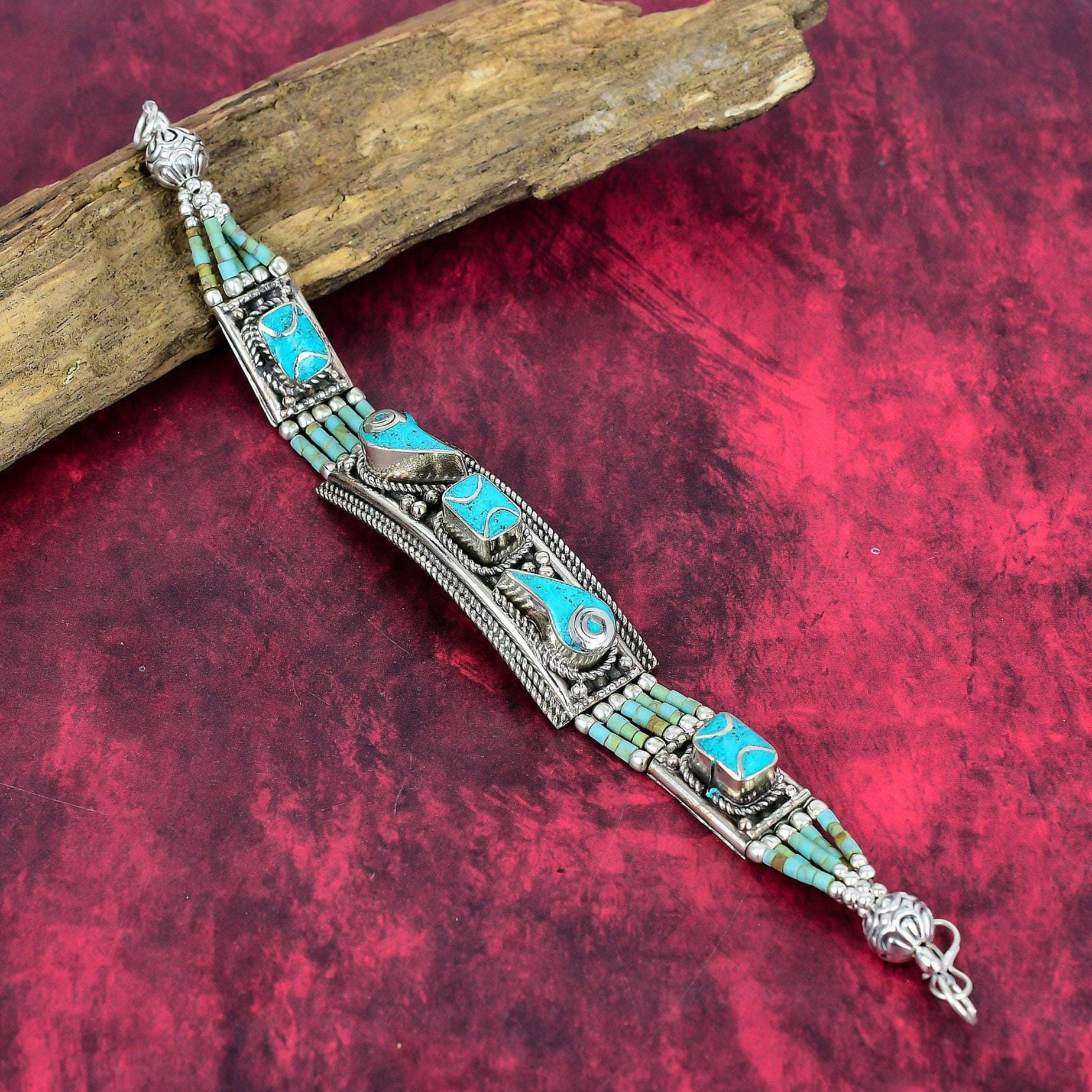 Turquoise Bracelet 925 Sterling Silver Tibetan Jewelry Handmade Bracelet Asian Nepal Jewelry Bohemia...
