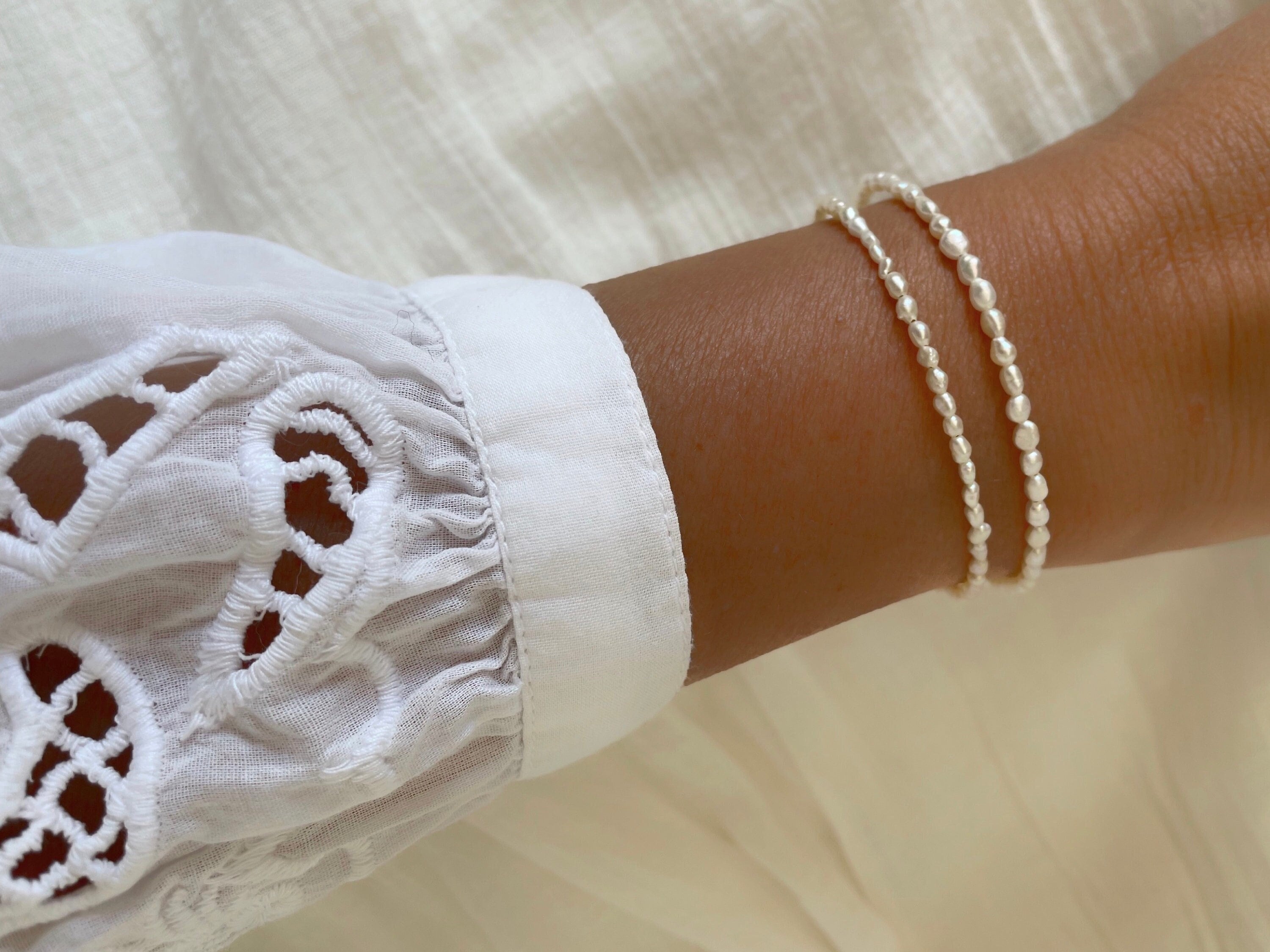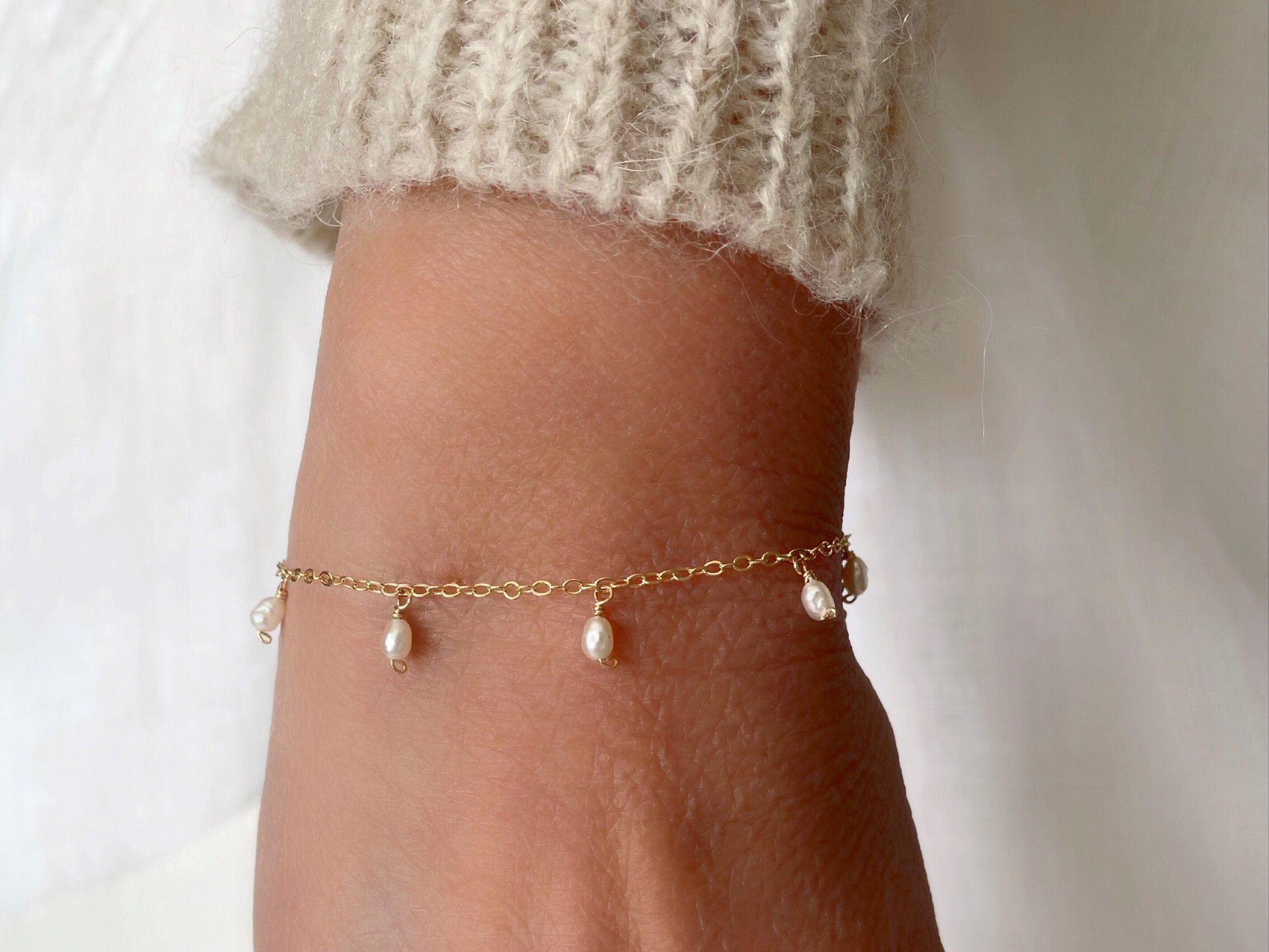"Our tiny pearl bar bracelet Emily is a must-have dainty pearl bracelet. Emily is made with sma...