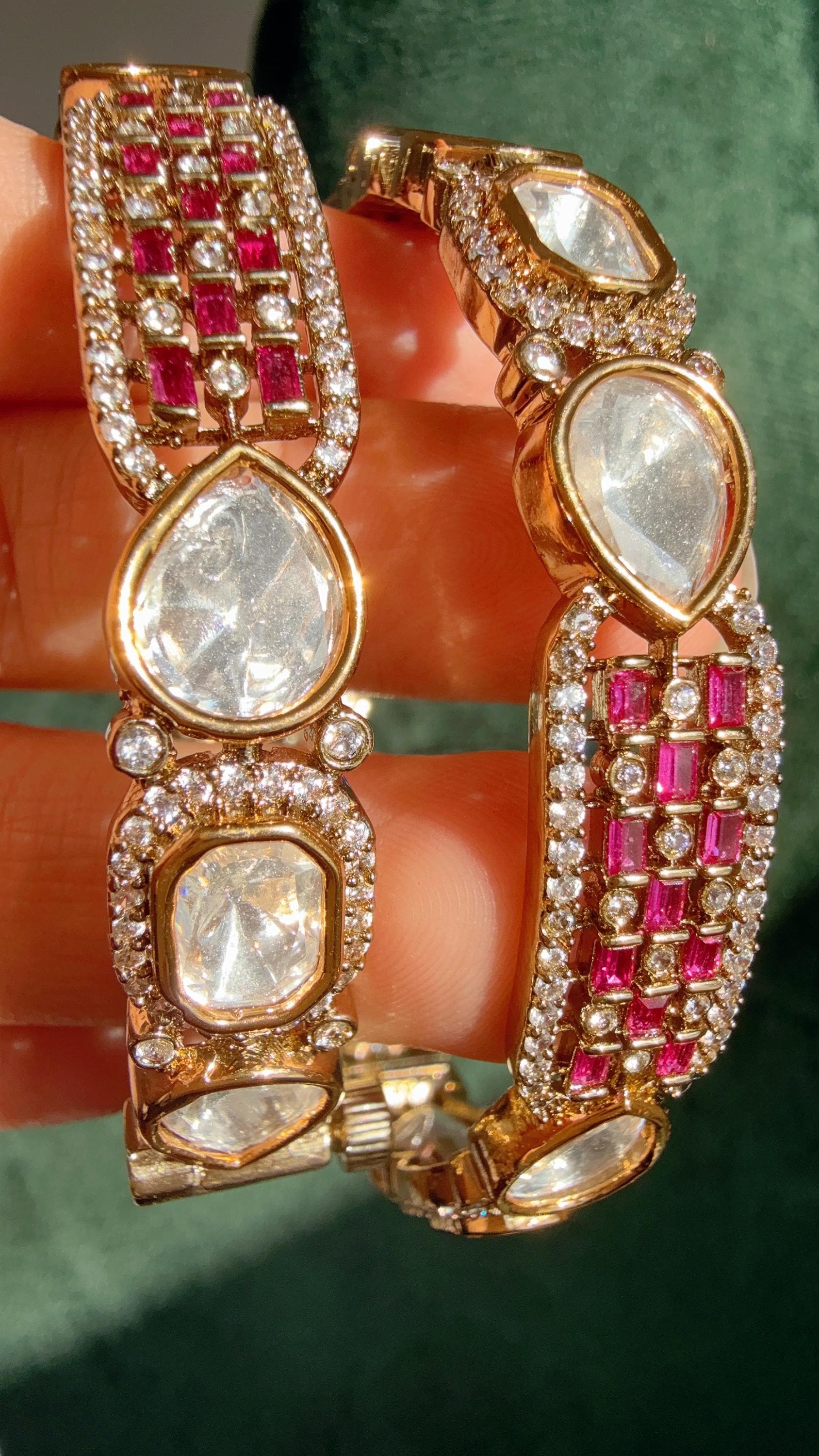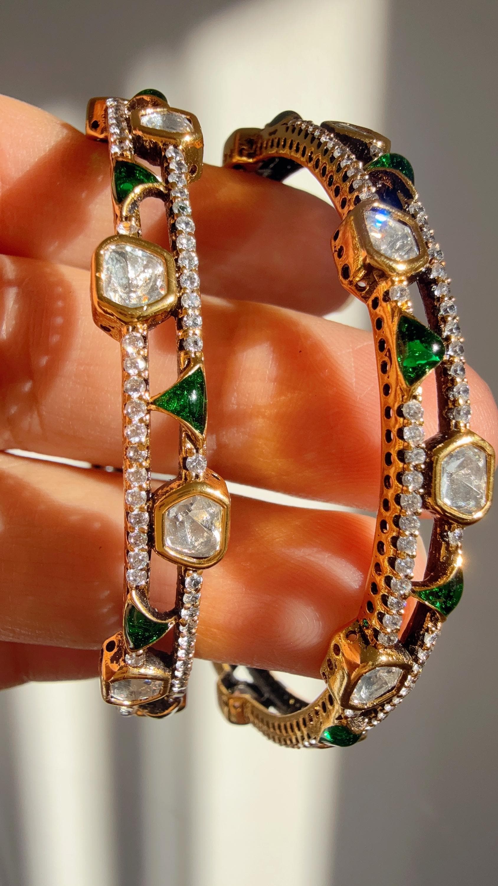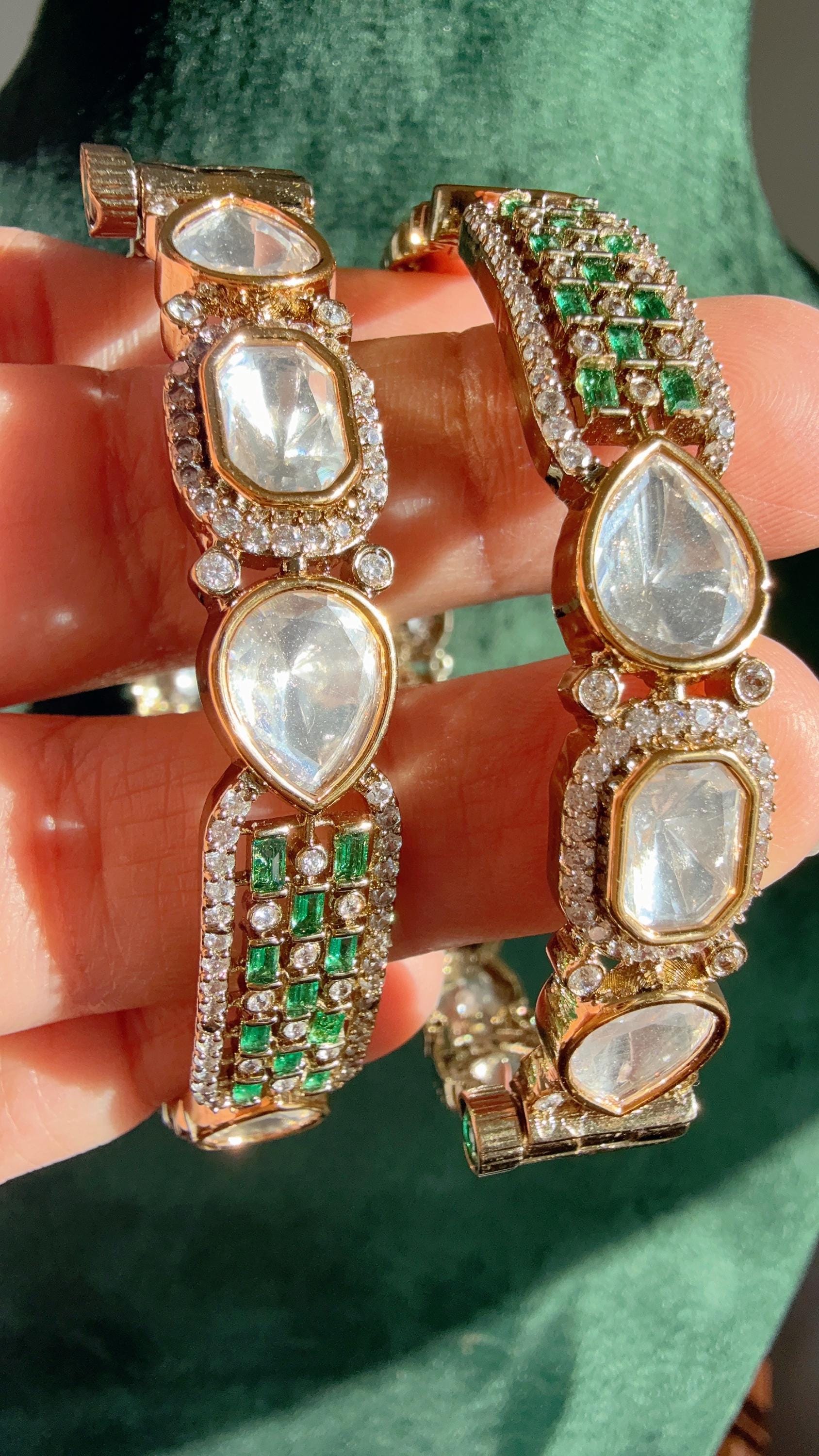 Gold plated Emerald Moissanite kundan bridal slim kada Bangles/Vict...