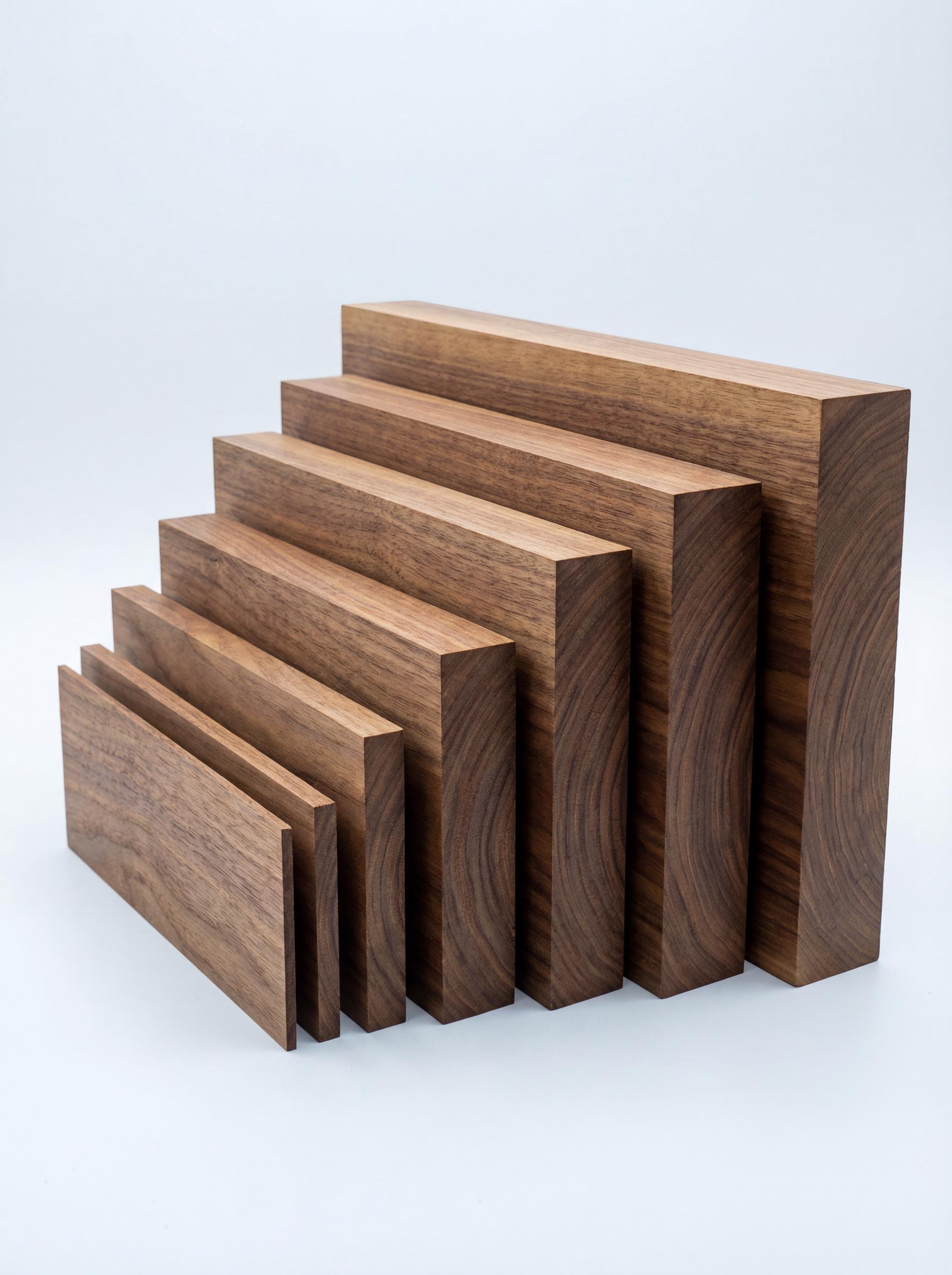 "Premium solid black walnut wood planks and panels with rich natural grain and deep brown tones...