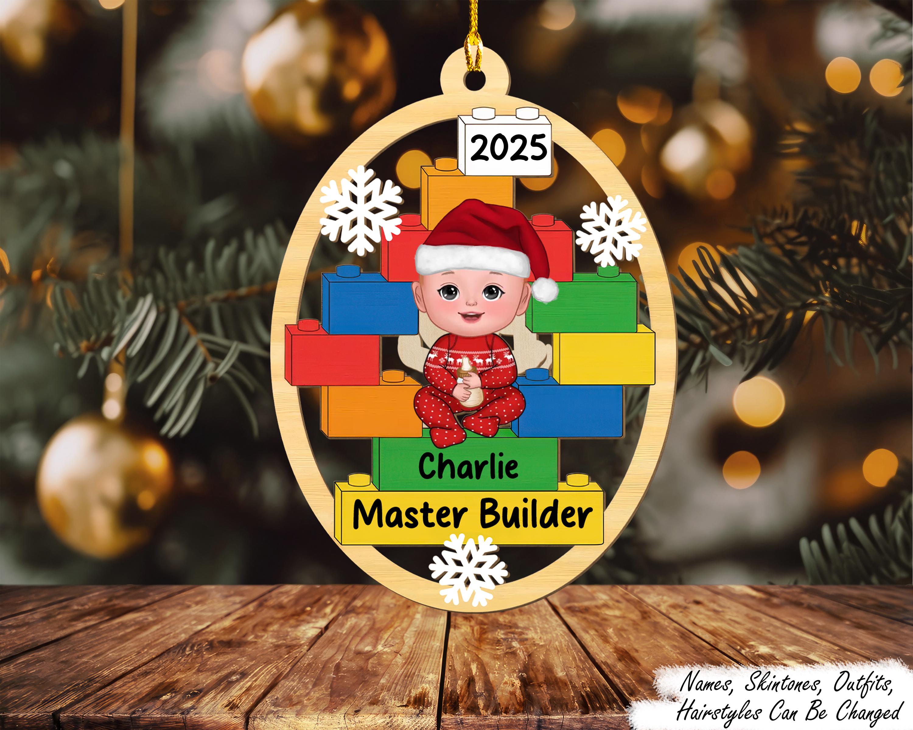 Master Builder Kid Boy Girl Personalized Christmas Wooden Ornament, Custom Christmas Brick Builder B...