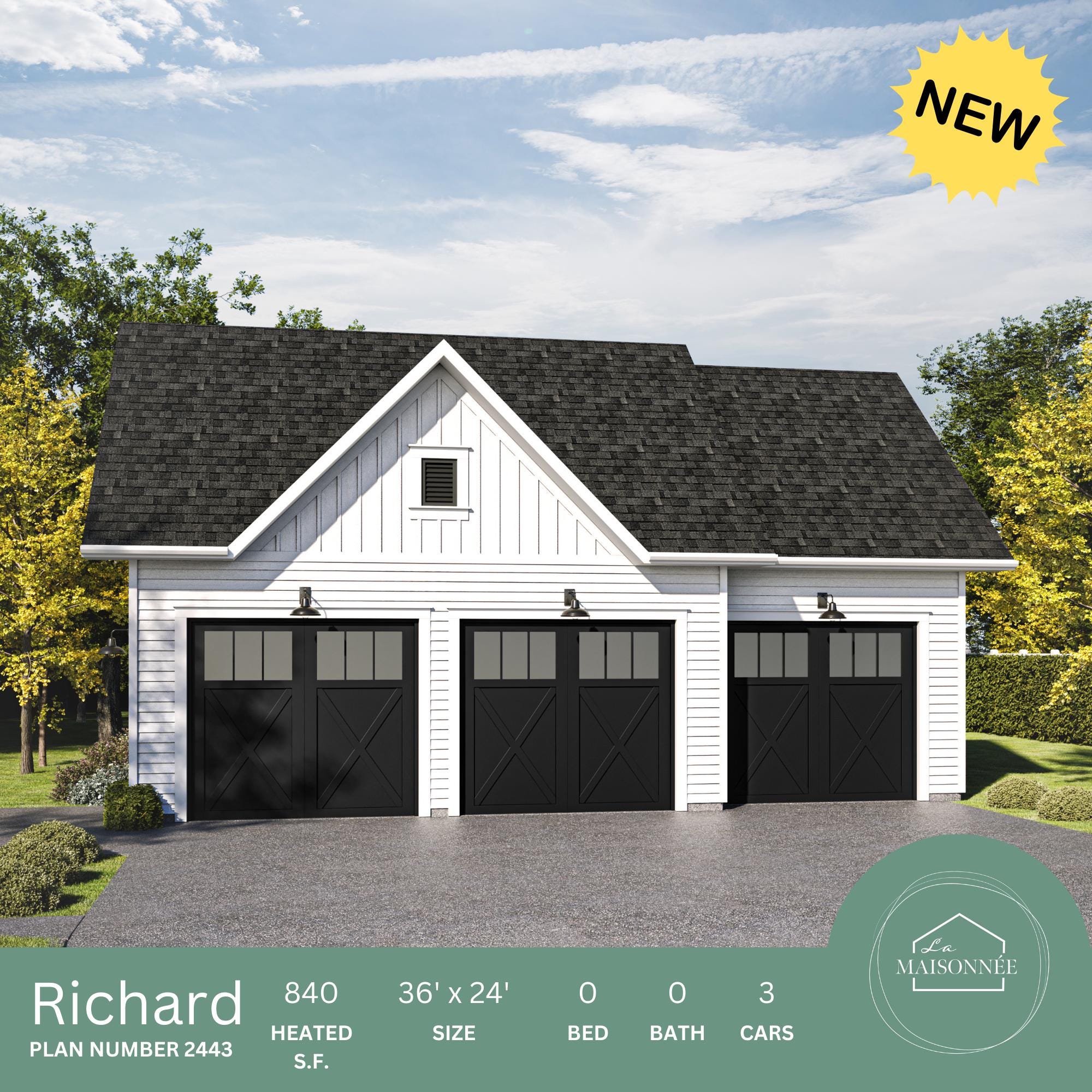 "PDF garage plans for 36'x24' 3-Car modern garage. Build your dream garage with the Richard mod...