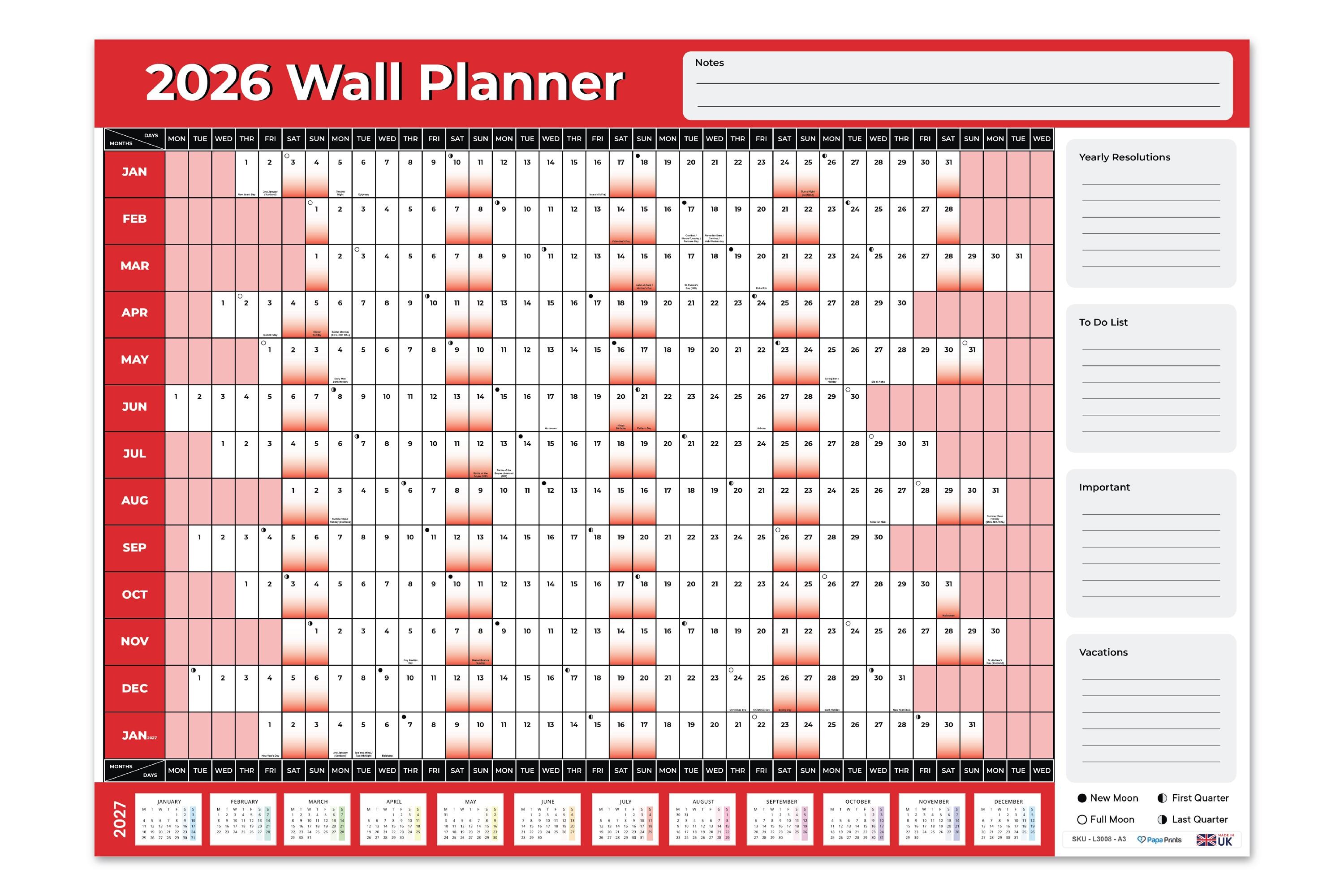 This portrait wall planner lays out the whole of January to December 2026 in a clear, easy-to-read f...