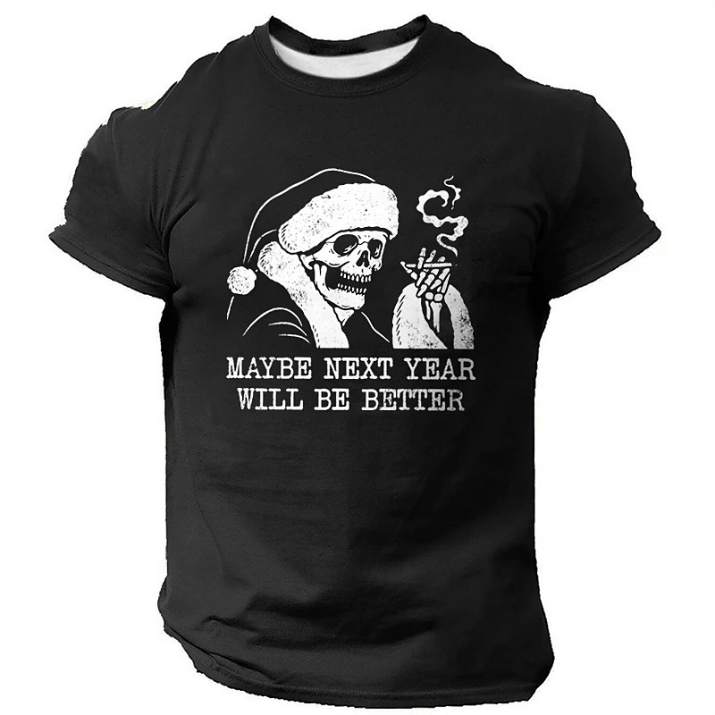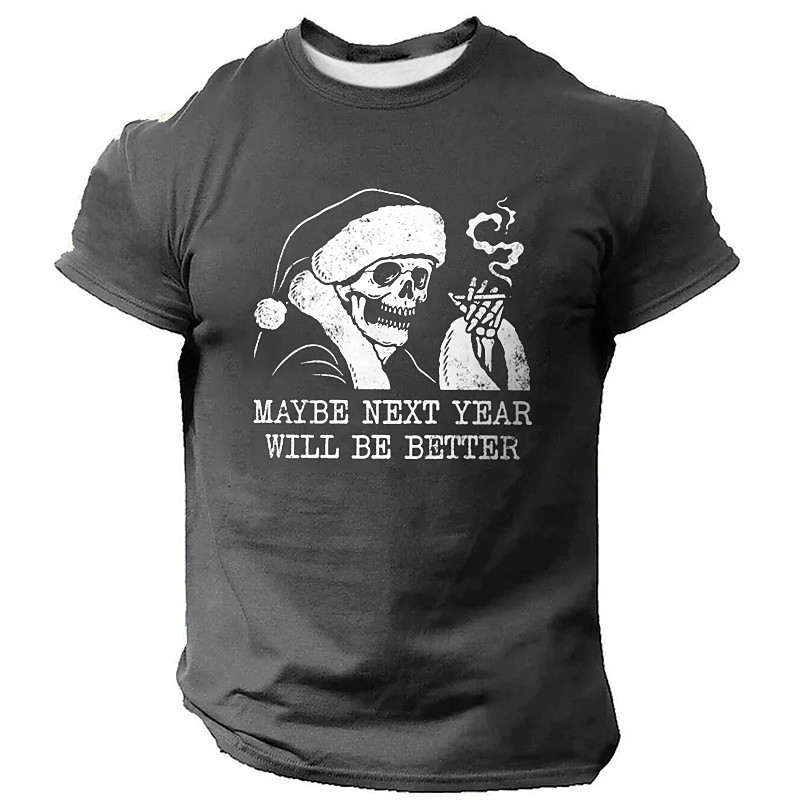 Men's Dark Humor Graphic T-Shirt: Santa Skeleton 'Maybe Next Year W...
