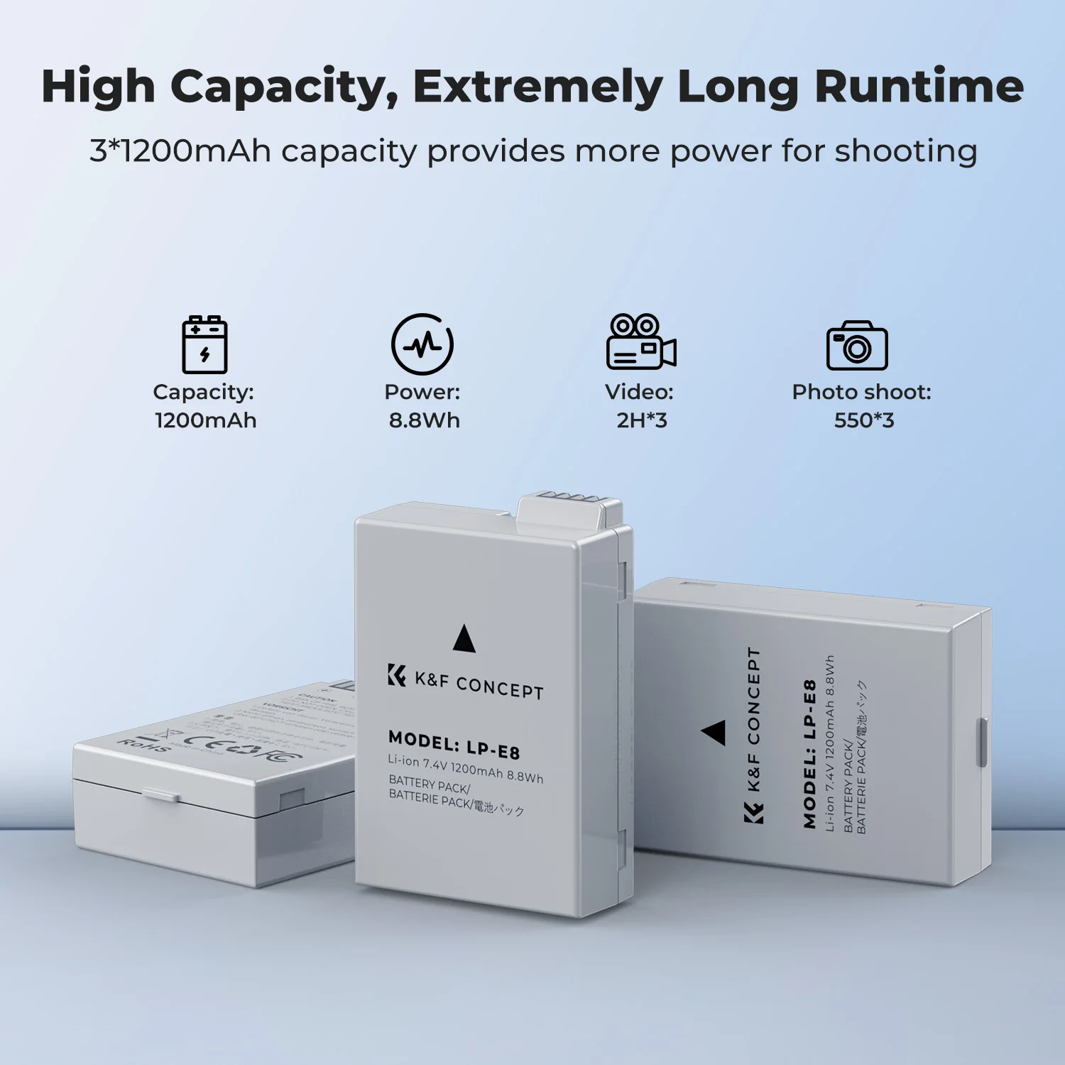 K&F CONCEPT 3-Pack LP-E8 Battery Upgraded LCD Charger for Canon EOS Rebel T2i T3i T4i T5i 550D K...