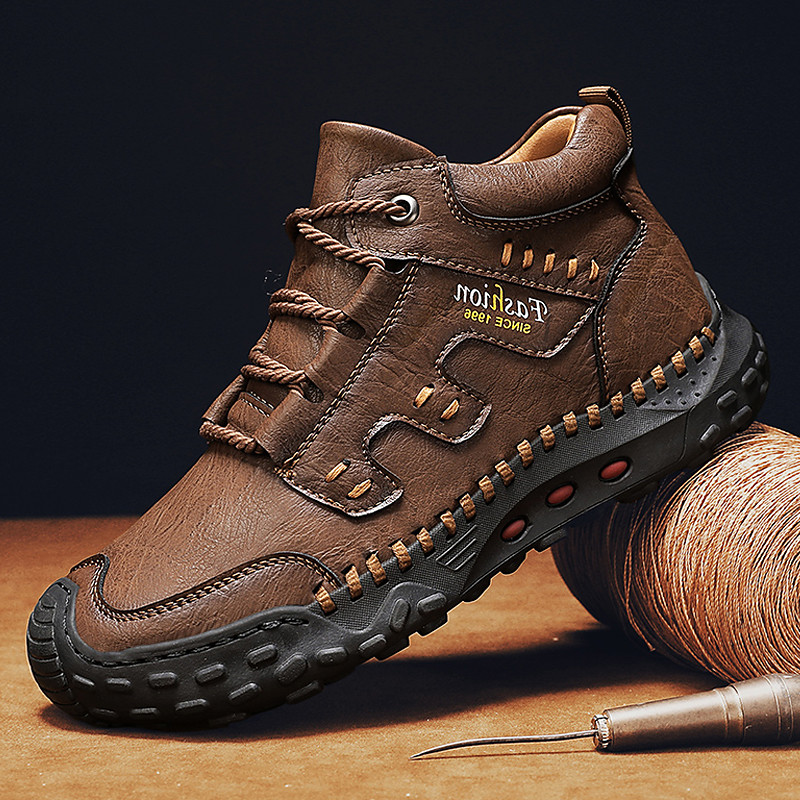 Men's Brown Faux Leather Outdoor Hiking Boots with Handcrafted Stit...