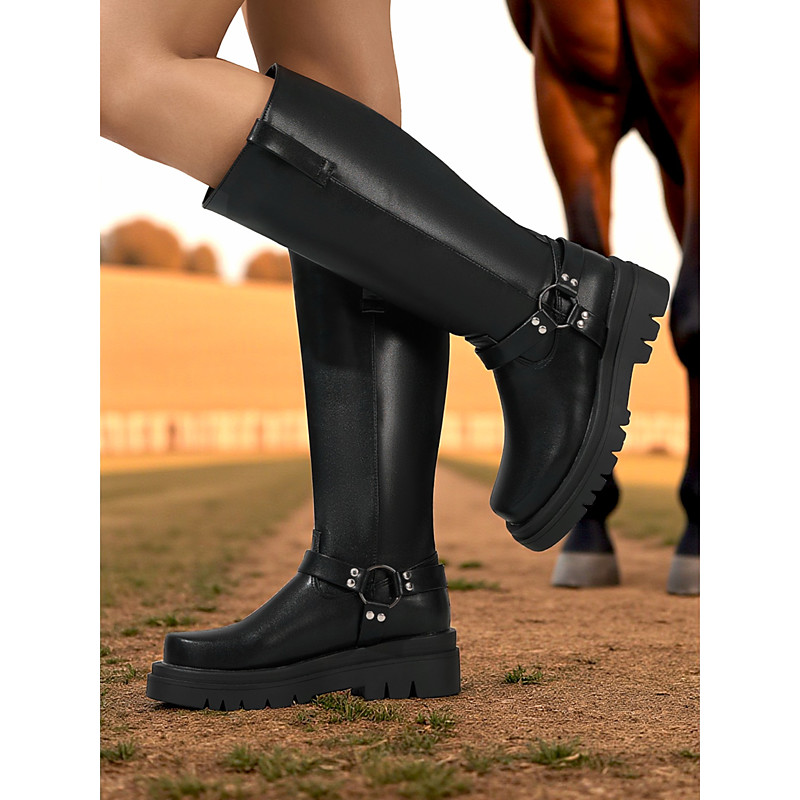 Women's Black Knee-High Platform Riding Boots - Chunky Lug Sole Har...