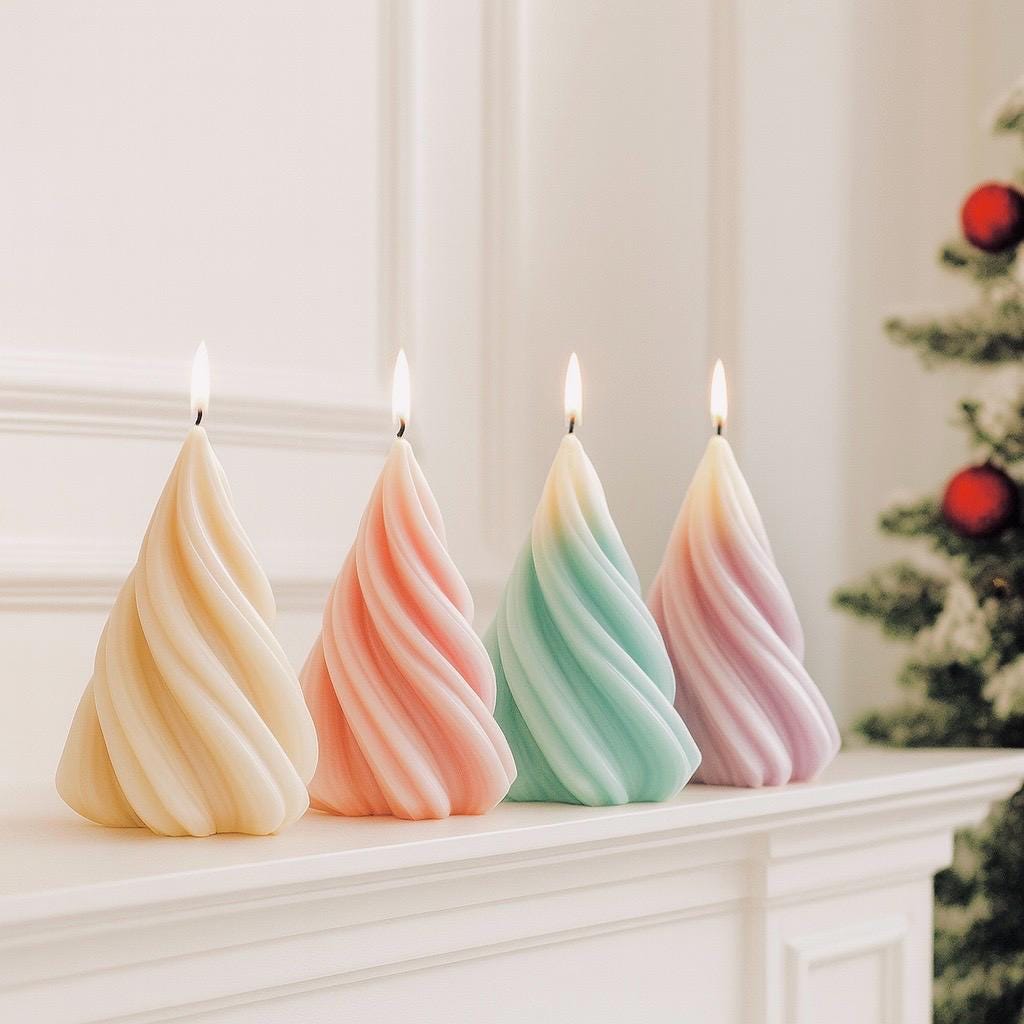 Bring soft holiday magic into your home with these handcrafted pastel Christmas tree candles. Each c...