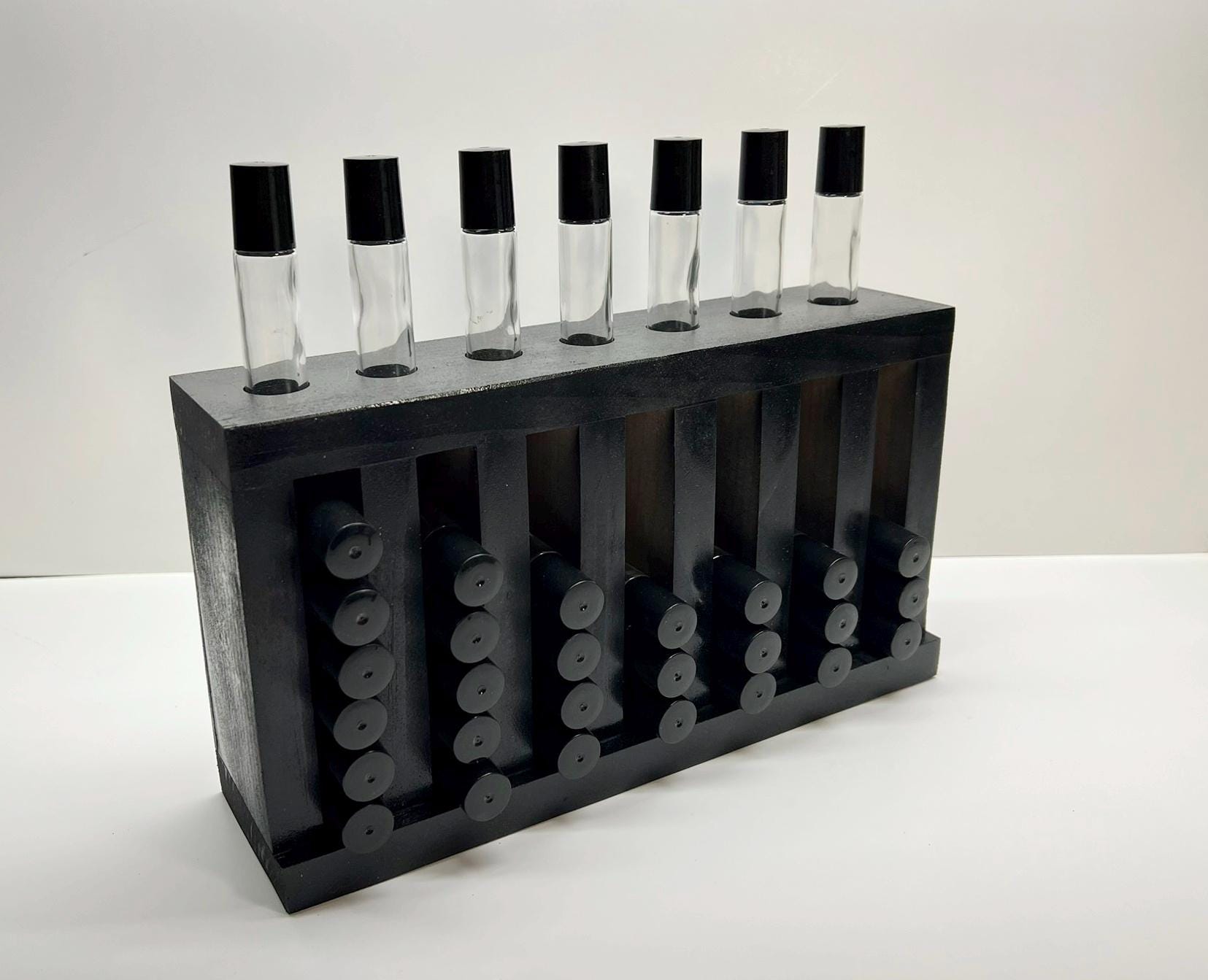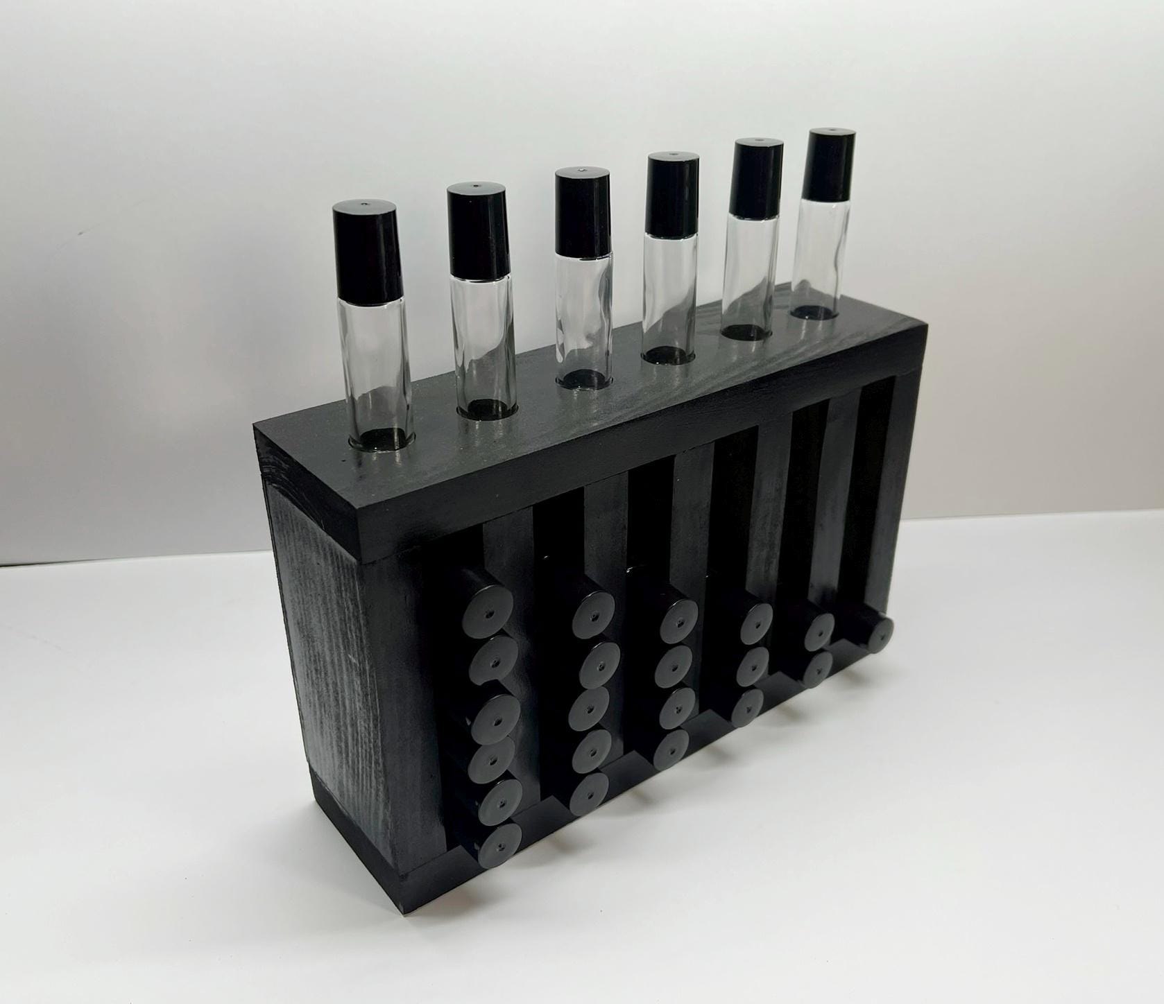 "Roll On Bottle Multi Level Displays Painted Black Will hold a total of 20 smooth sided 10ml Ro...