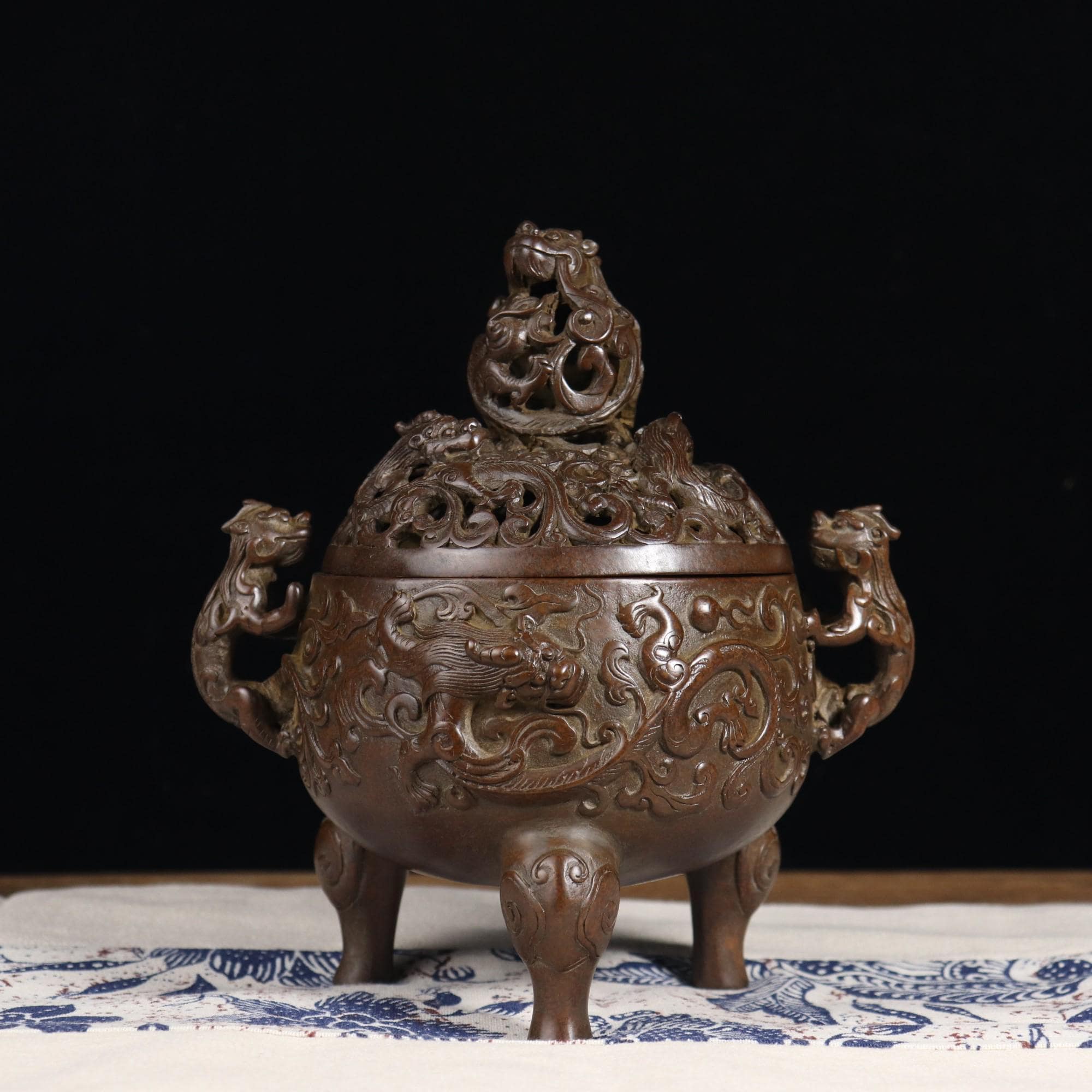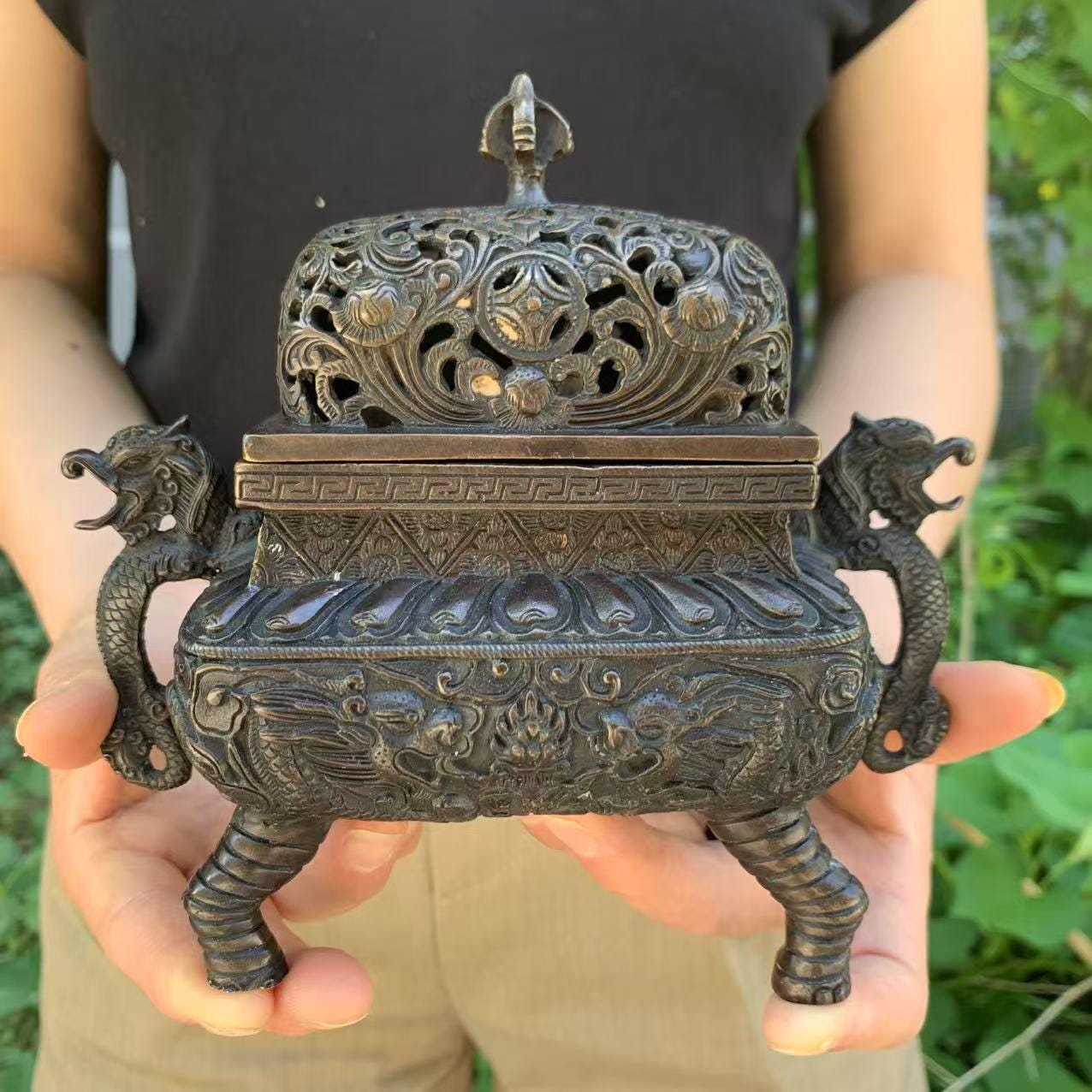 Chinese antique Collection Copper Flowers beast Dragon ear incense ...