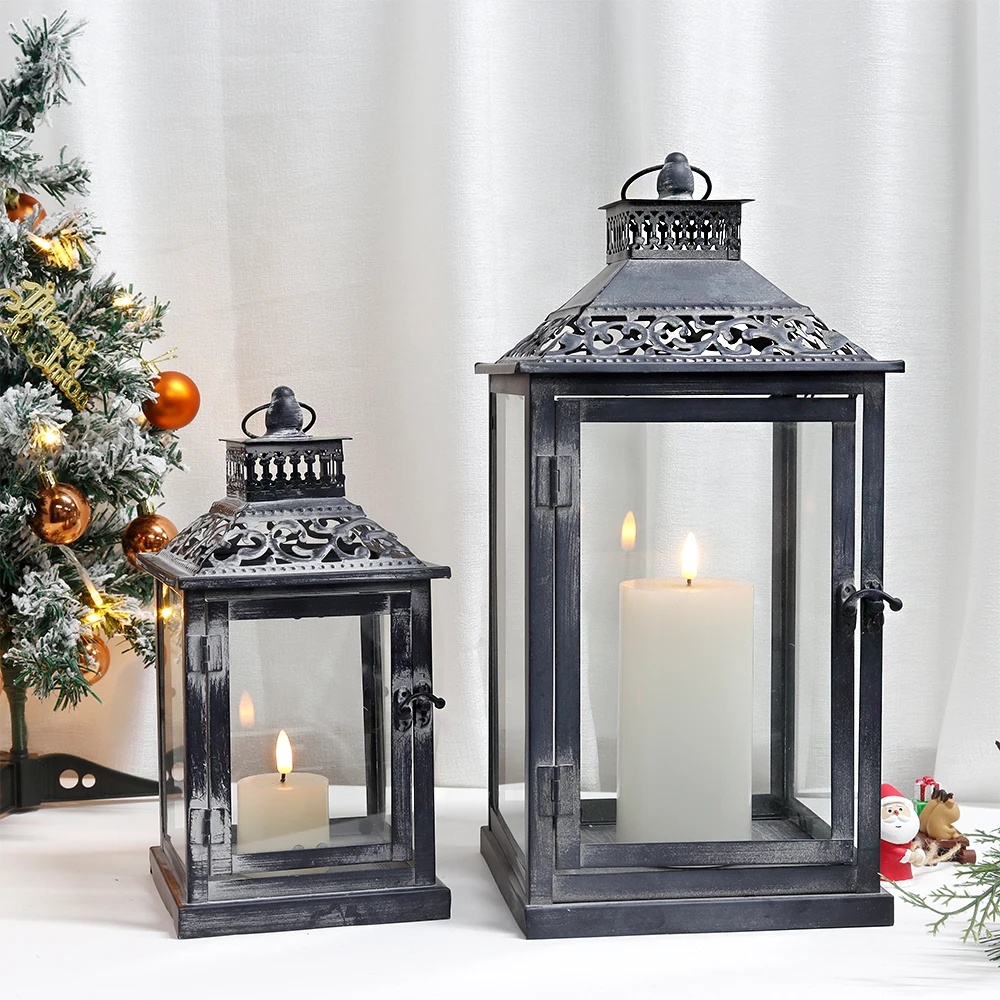 Set of 2 Antique Black Square Candle Lantern Hanging Portable Candl...