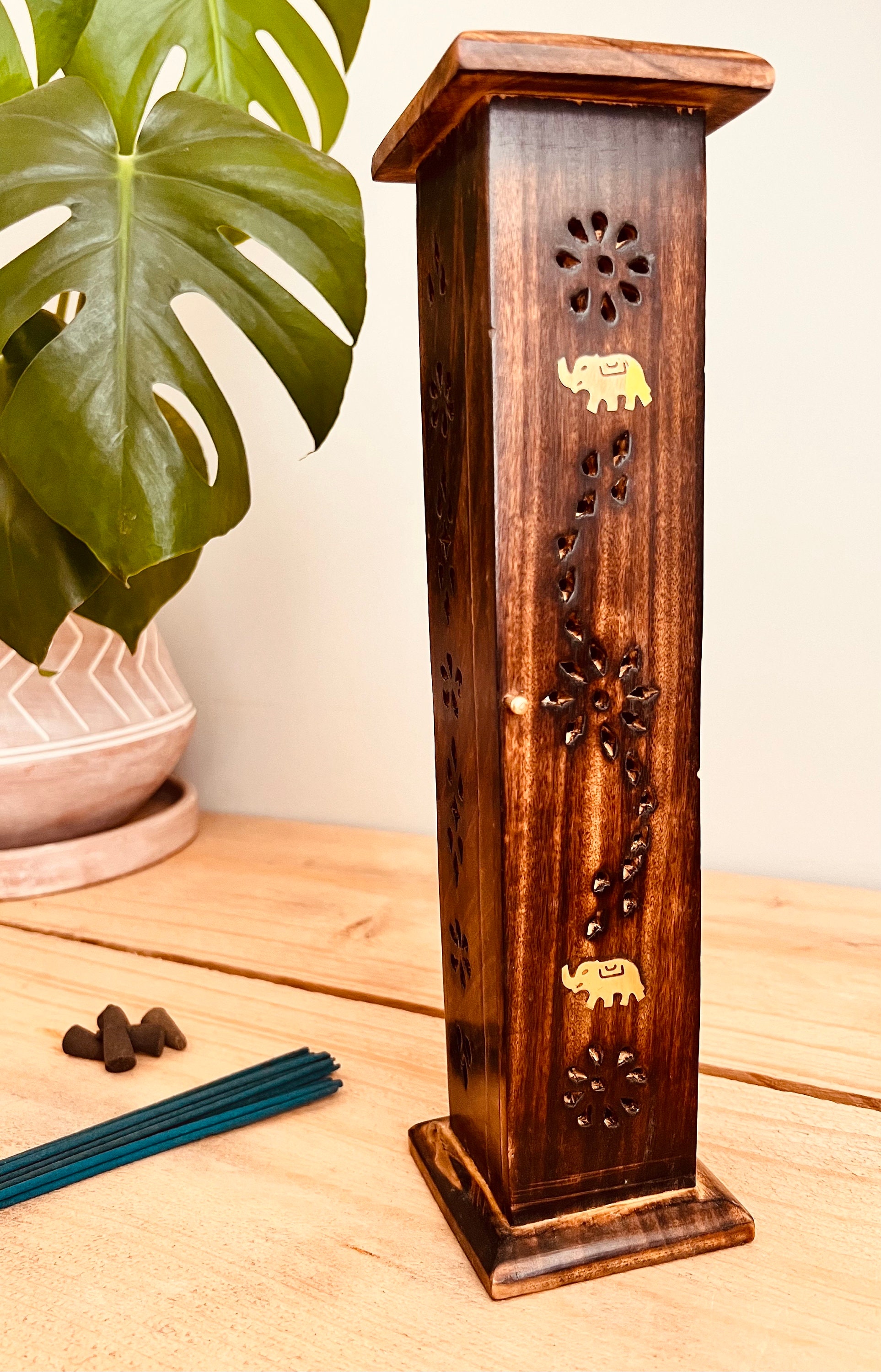Handmade Mango Wood Incense Burner Tower, Elephant Design