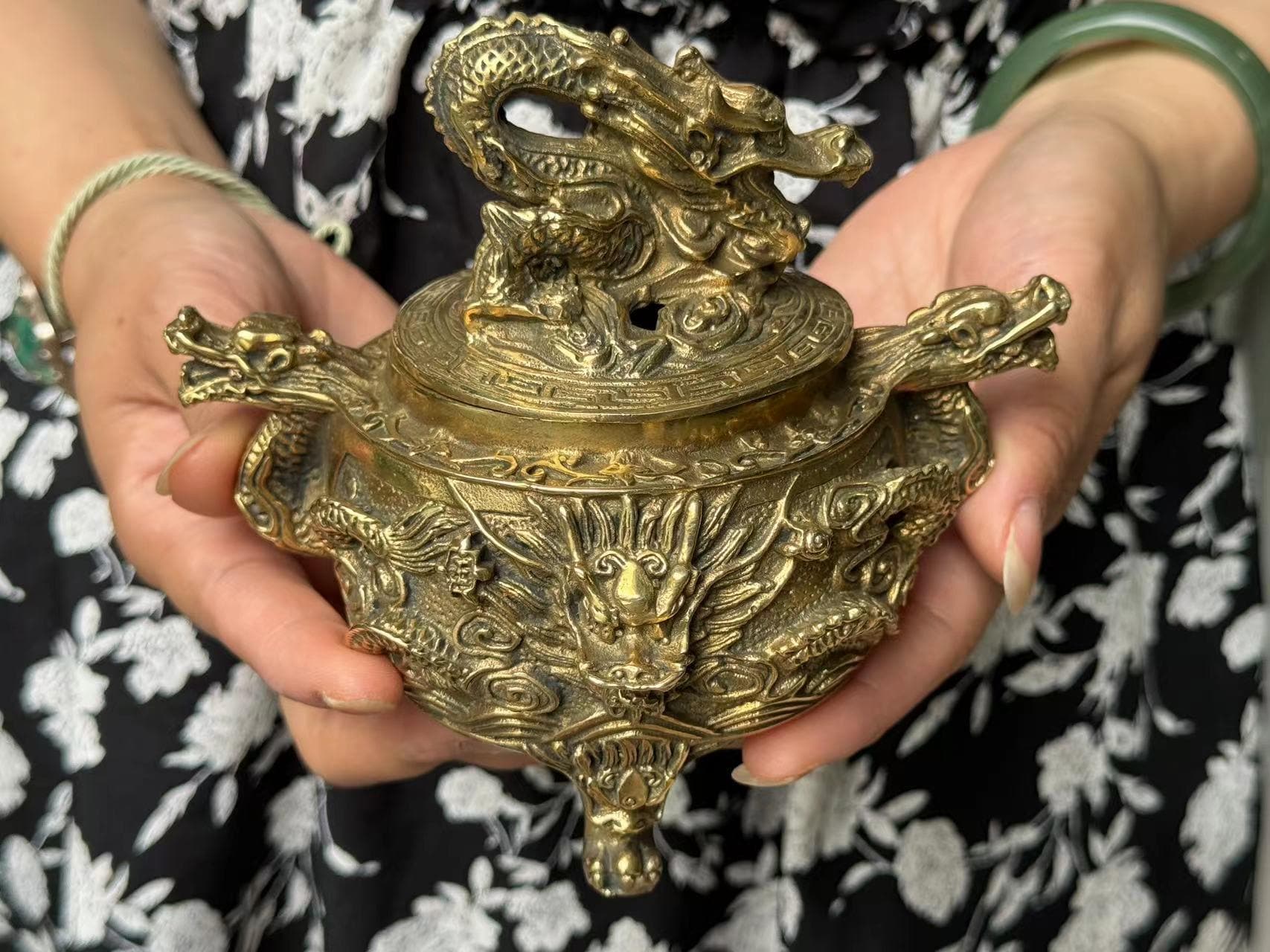 Vintage Copper Chinese Dragon relief Incense Burner Holder lucky we...
