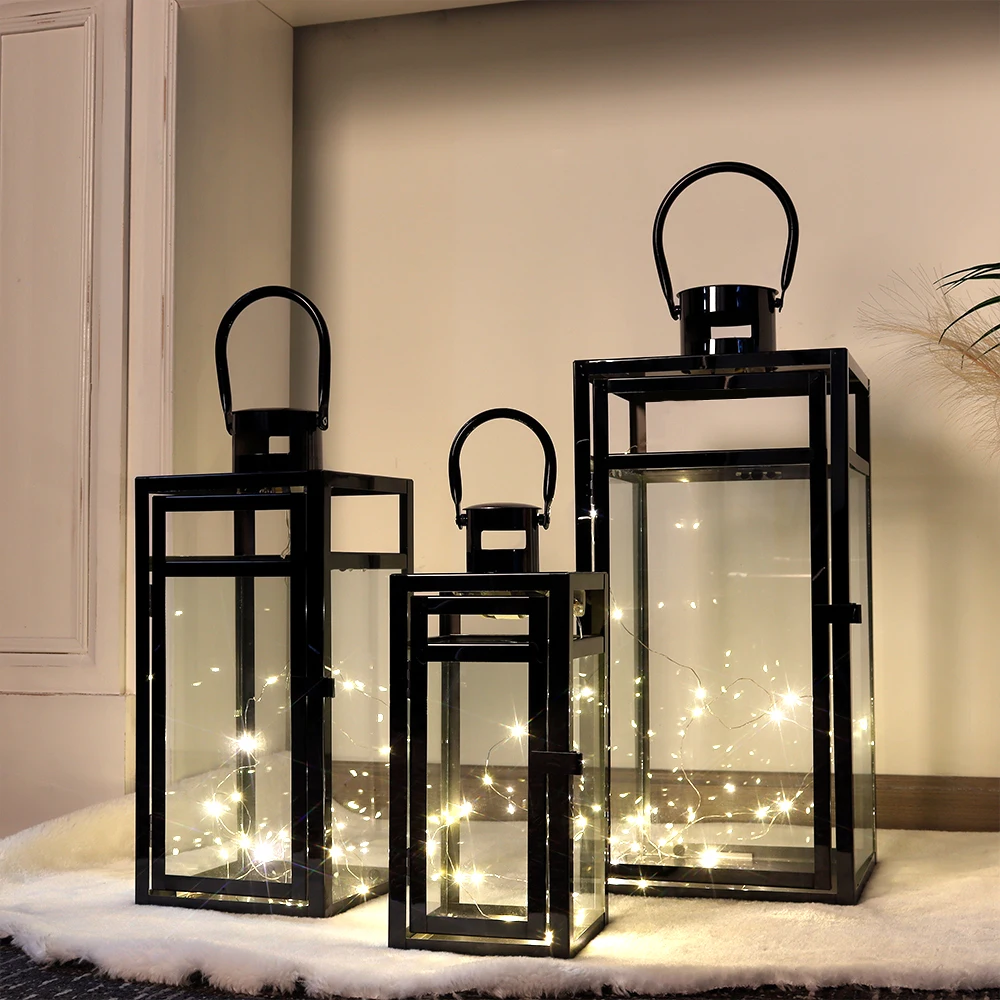 Set of 3 Modern Large Black Metal Candle Lantern Garden Hanging Met...