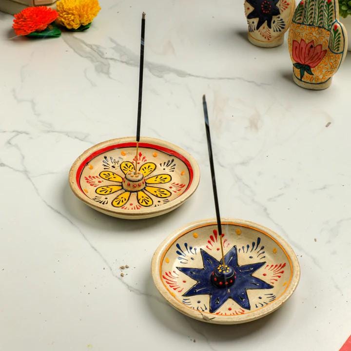 "This circular hand-painted clay incense holder adds color and charm to your space. Crafted by ...