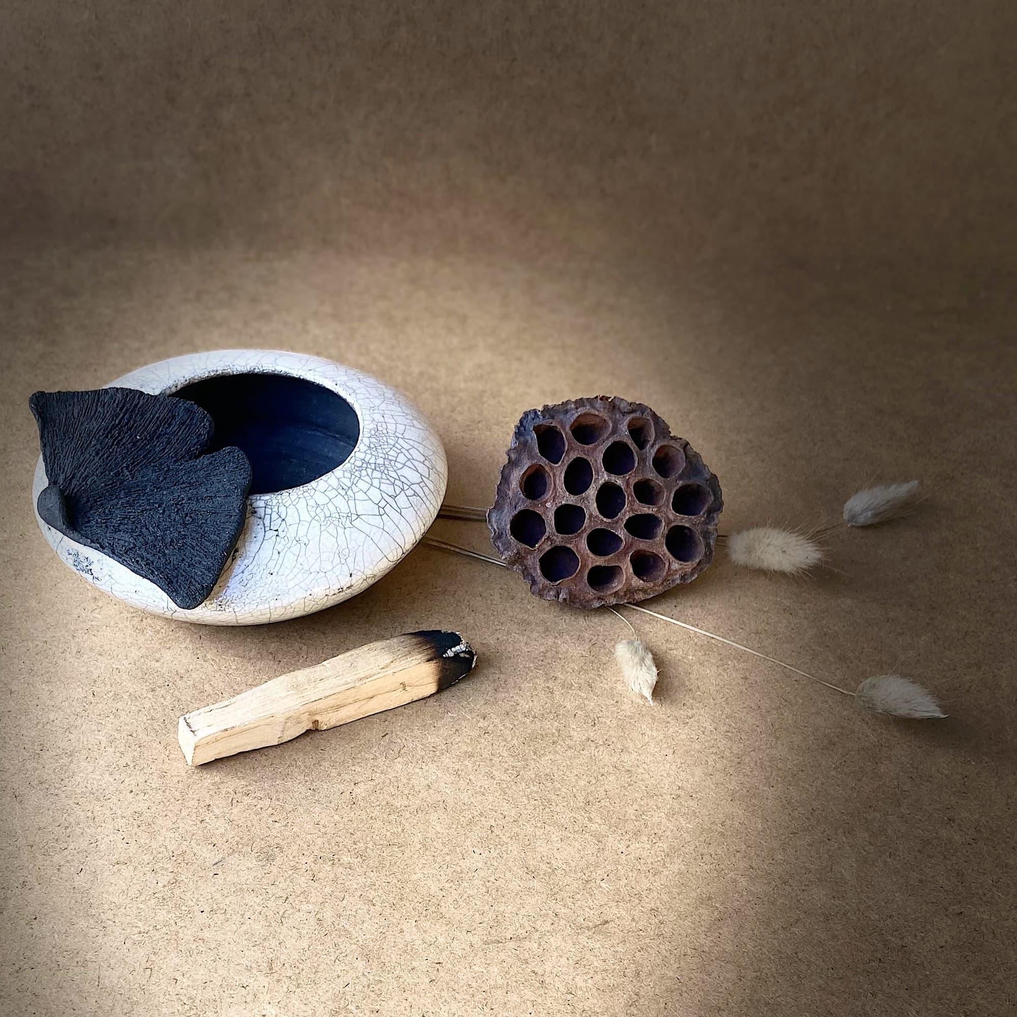Palo Santo wood incense burner in white raku ceramic, adorned with ...
