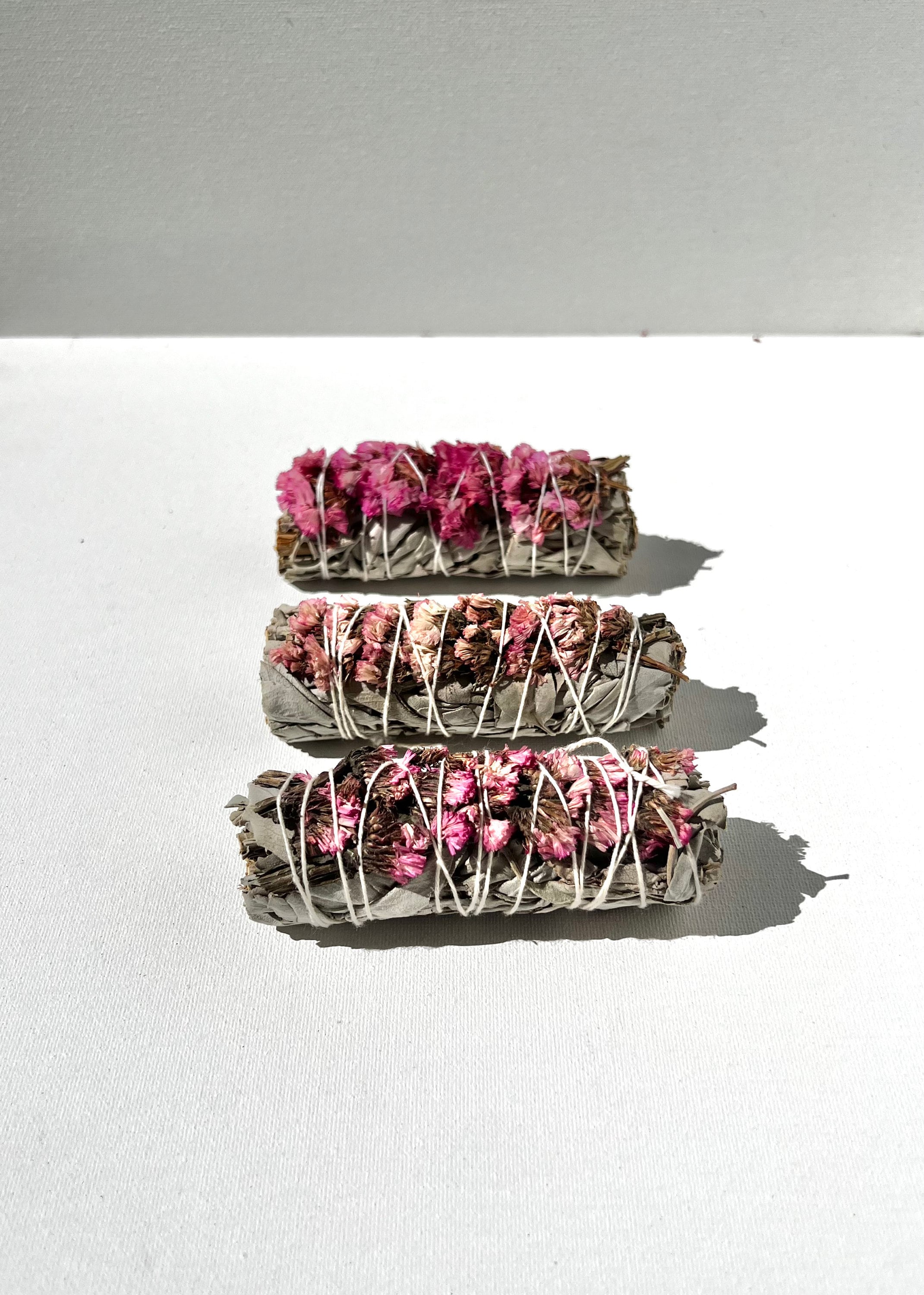 "Handcrafted Floral Sage Smudge Stick (4\") Aromatic white sage with vibrant pink sinuata ...