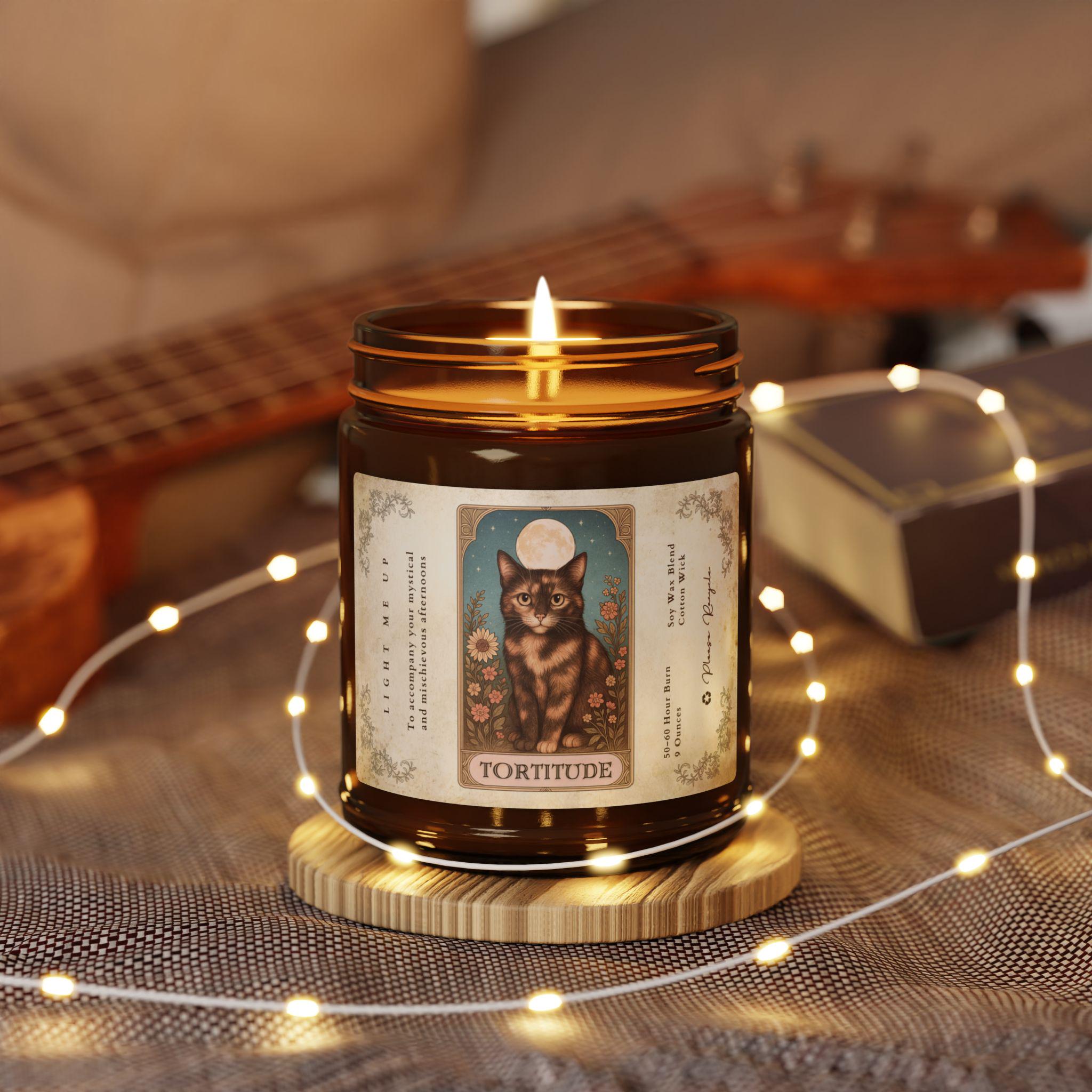 Celebrate the unique personality of tortoiseshell cats with this premium Tortitude candle, a mystica...