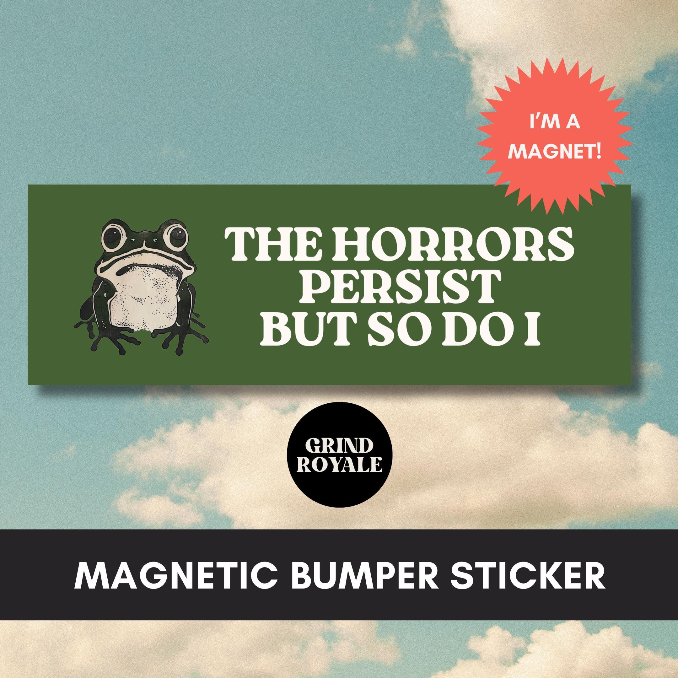 "\"The Horrors Persist But So Do I\" Dark Humor Frog Car Bumper Magnet Add a some fla...