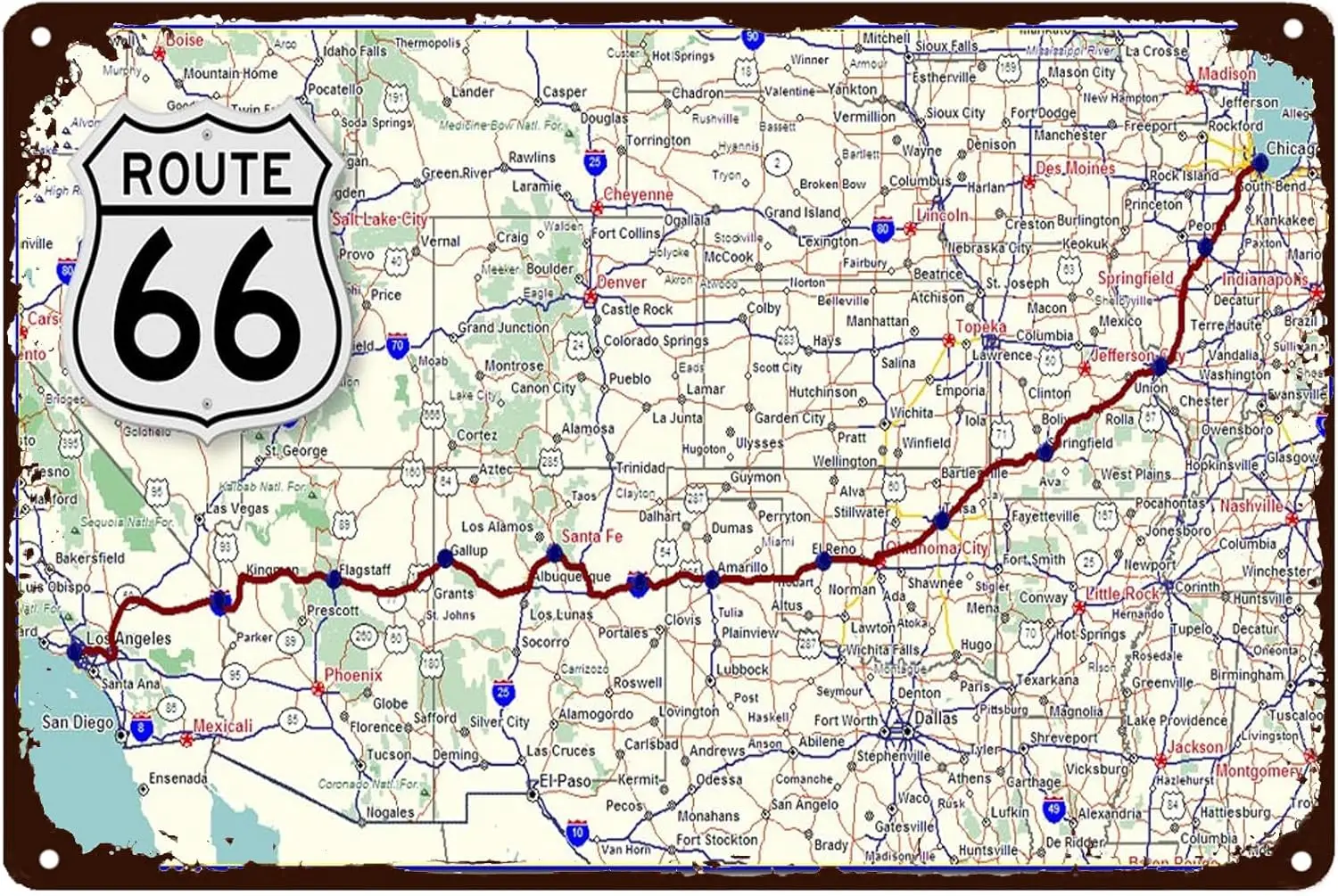 Route 66 Highway Map Vintage Tin Sign Historic Old Route 66 Car Signs Retro Tin Poster Plaque for Ho...