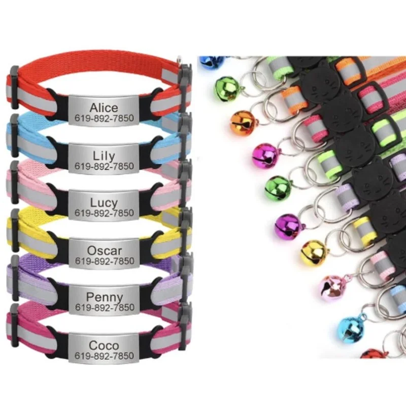 Customized Cat Collar Reflective Cat Collar Free Engraved Puppy Kitten Pet ID Nameplate Necklace Wit...
