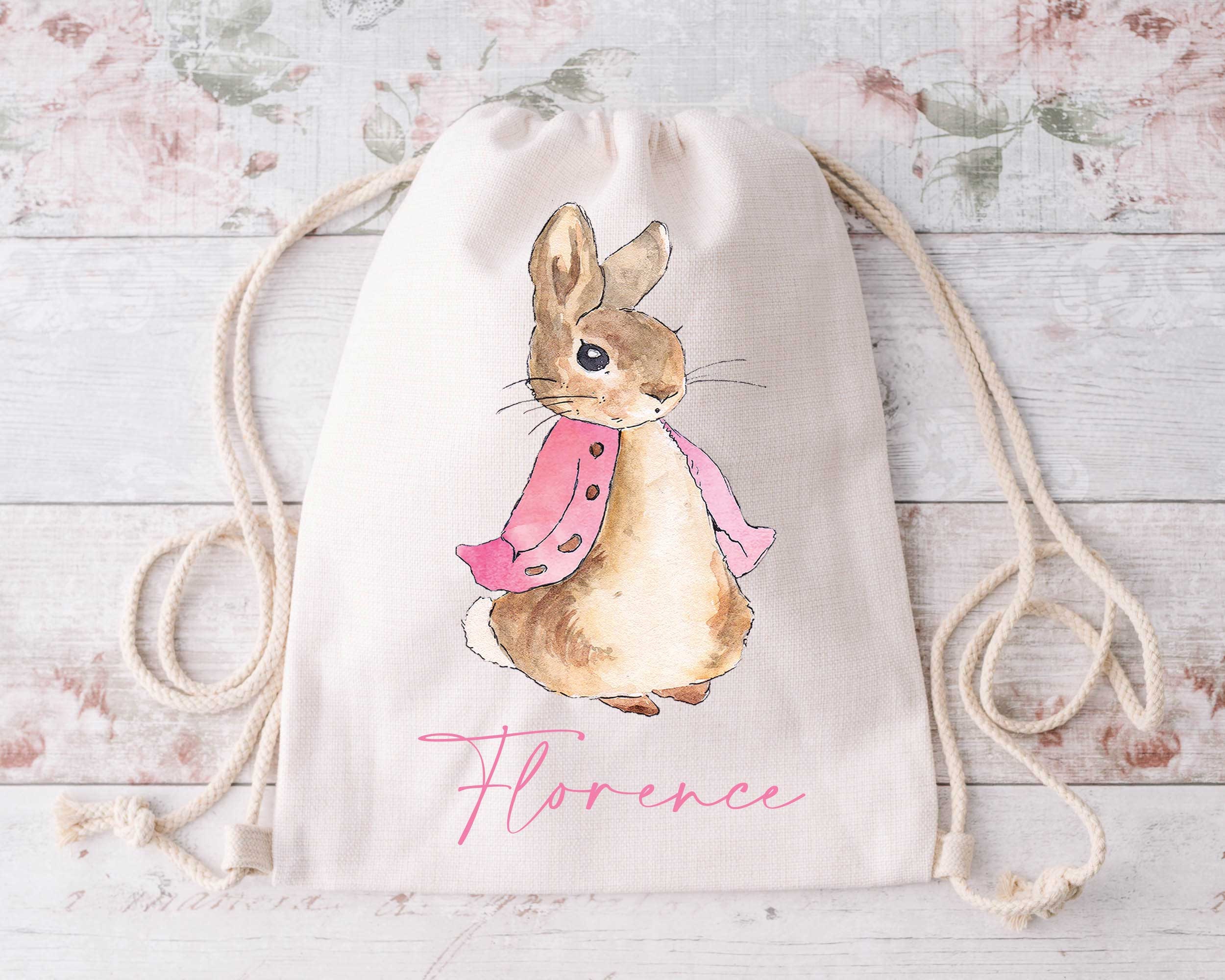 Pink Peter Rabbit Flopsy Inspired Kids Drawstring Bag, Girl Persona...