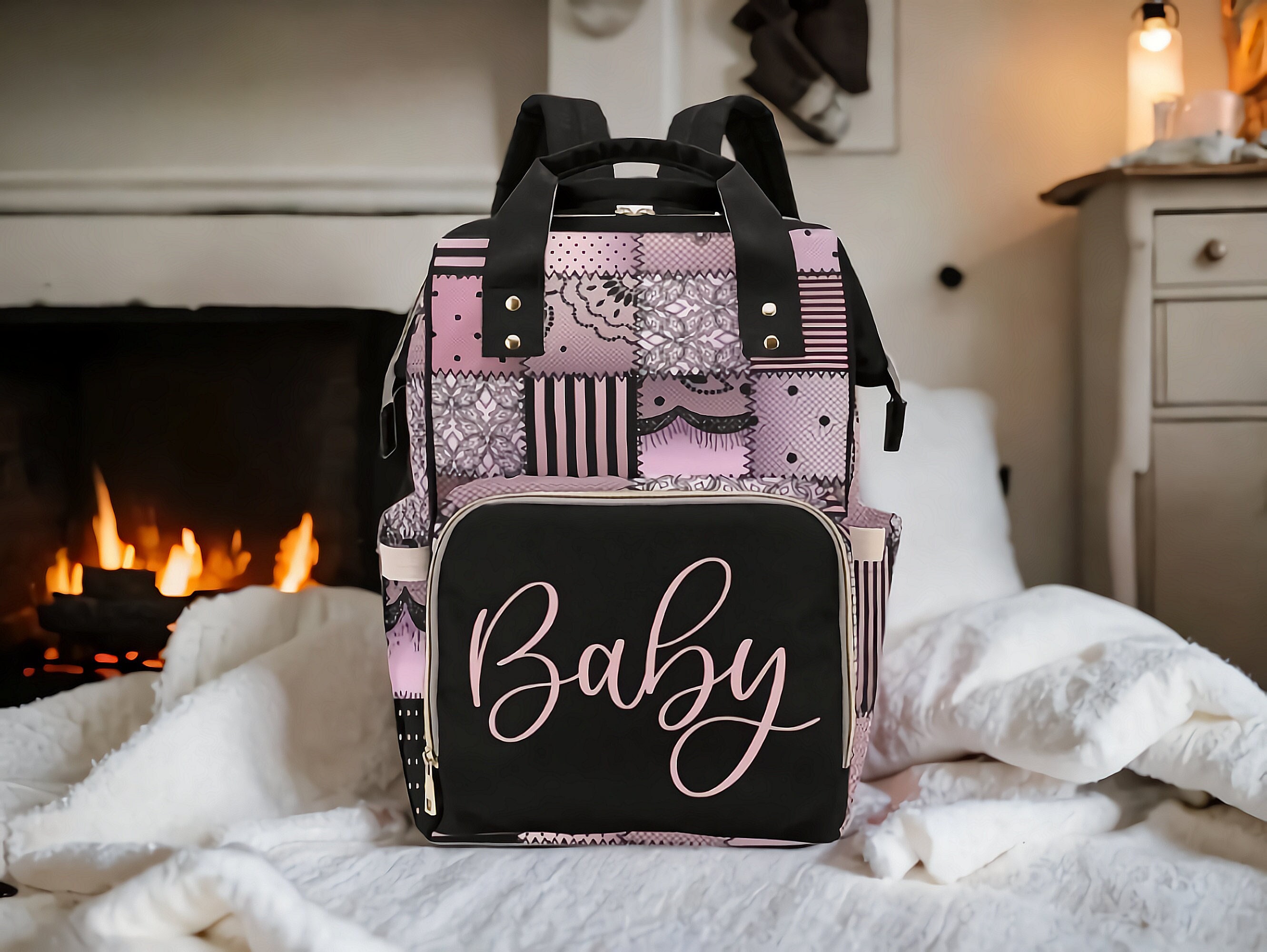 "Our Diaper Bag Backpack, featuring a quilt-like pink design, is the perfect personalized custo...