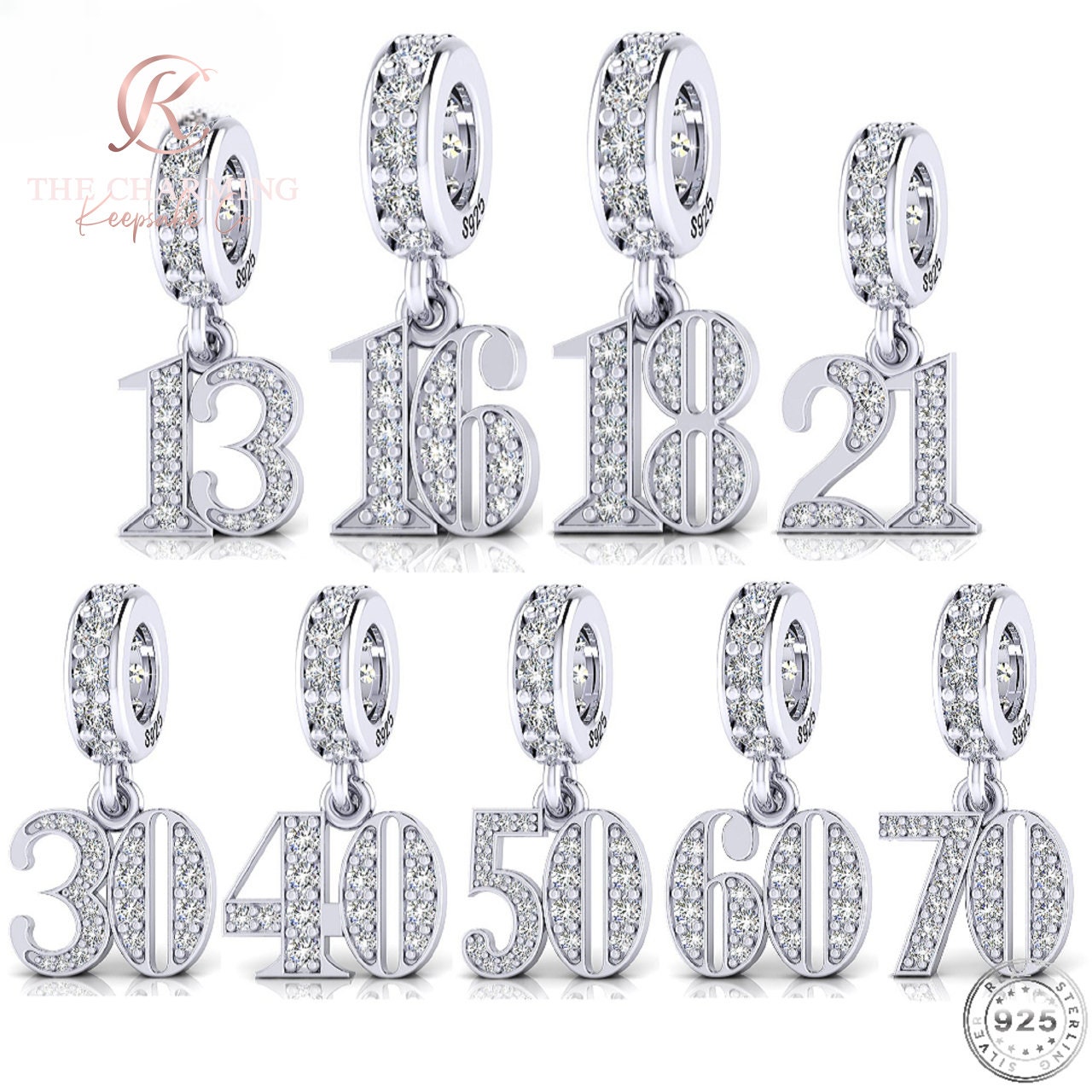 Beautiful and high quality 925 sterling silver birthday dangle charm featuring pave set numbers in s...