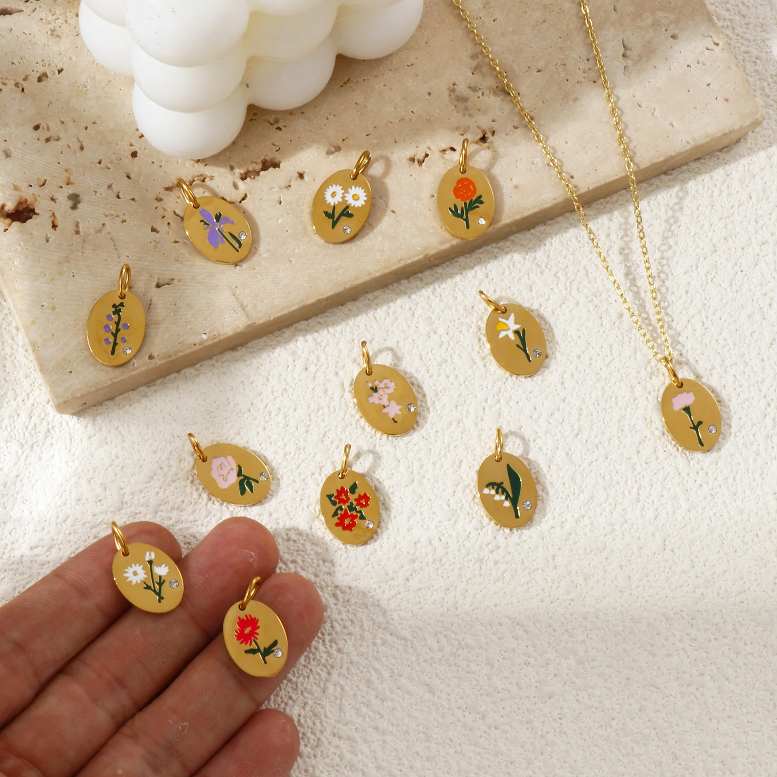 1 Piece 304 Stainless Steel Birth Month Flower Charms Enamel Oval F...