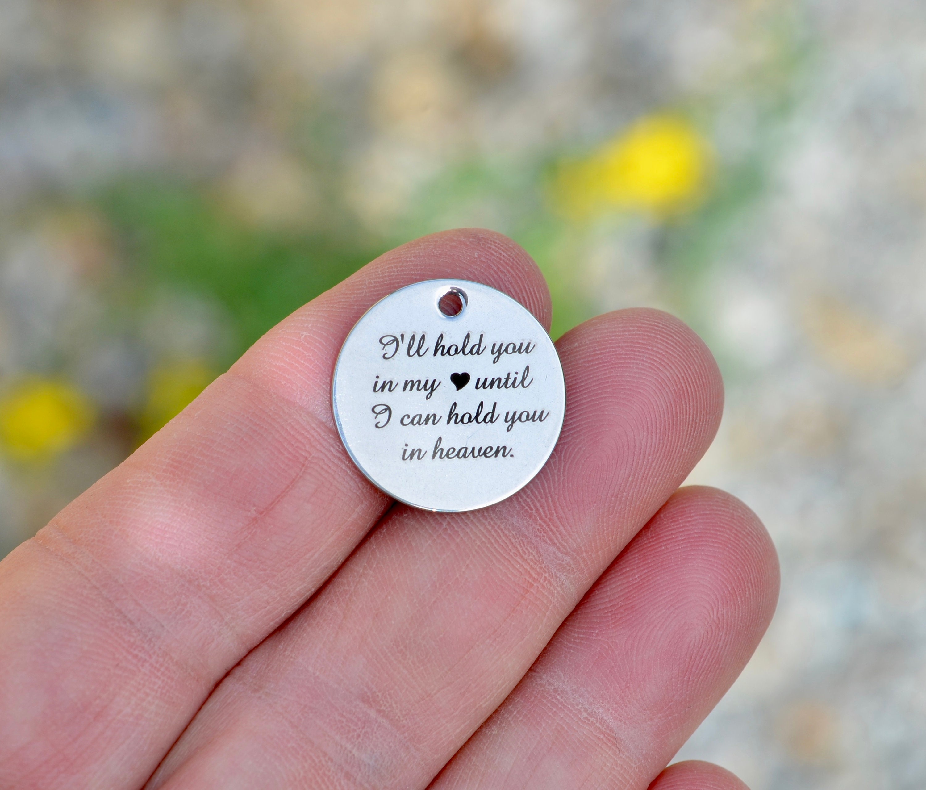 I'll hold you in my heart until I can hold you in heaven Stainless Steel 20mm Round Charm laser engr...