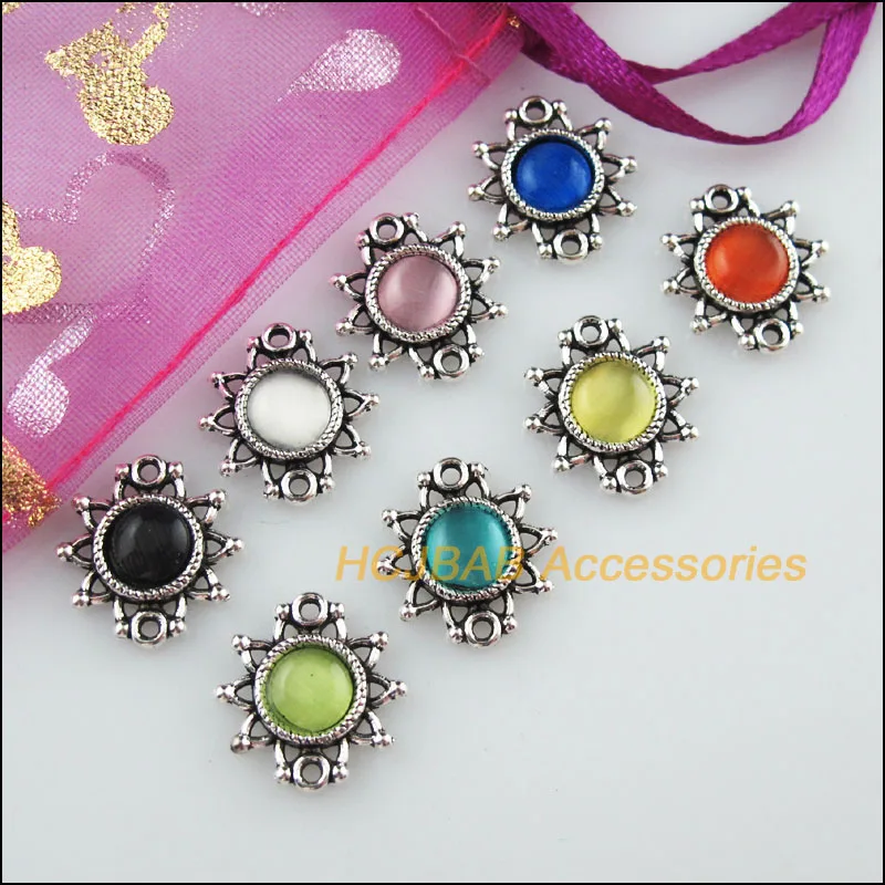 16Pcs Tibetan Silver Flower Mixed CatEye Stone Charms Pendant Connectors 14x15mm