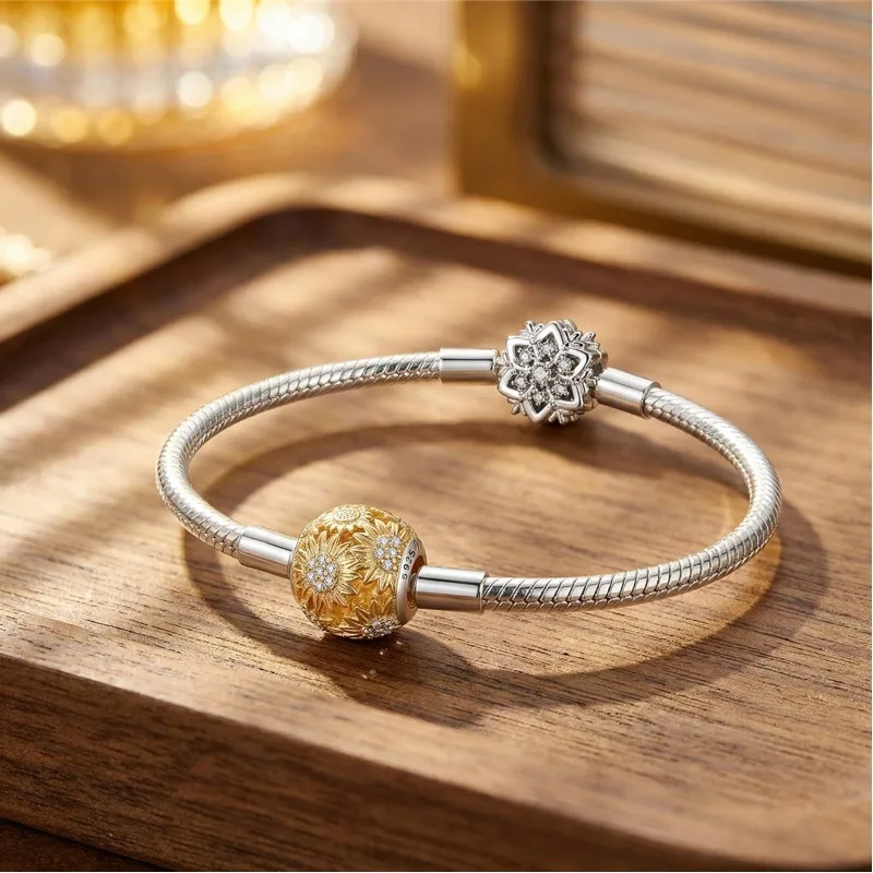 925 Sterling Silver Sunflower bead Charms Pendant with Cubic Zirconia,Fit DIY bracelet necklace Gift...