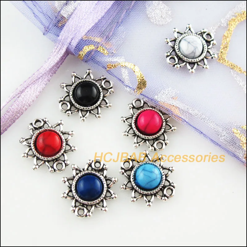 24Pcs Tibetan Silver Flower Mixed Stone Charms Pendant Connectors 14x14.5mm