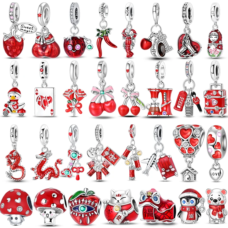 Red Series Charms Beads 925 Sterling Silver Red Suitcase Hot Air Balloon Dumbbell Boxing Gloves Pend...