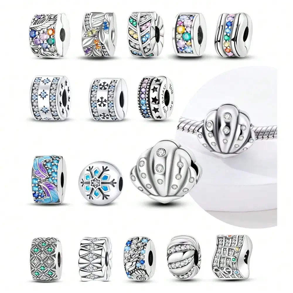 Clasp 925 Sterling Silver CZ pave Clip Charms the sun, moon and stars Beads Chain fit Original Bangl...