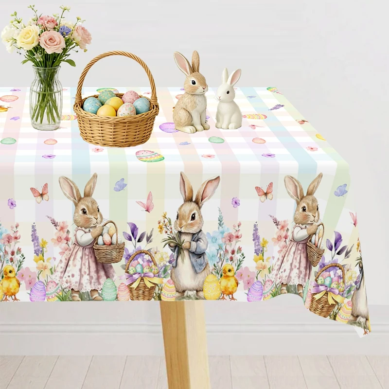 Vintage Easter Bunny Eggs Plaid Disposable Tablecloth Easter Decora...