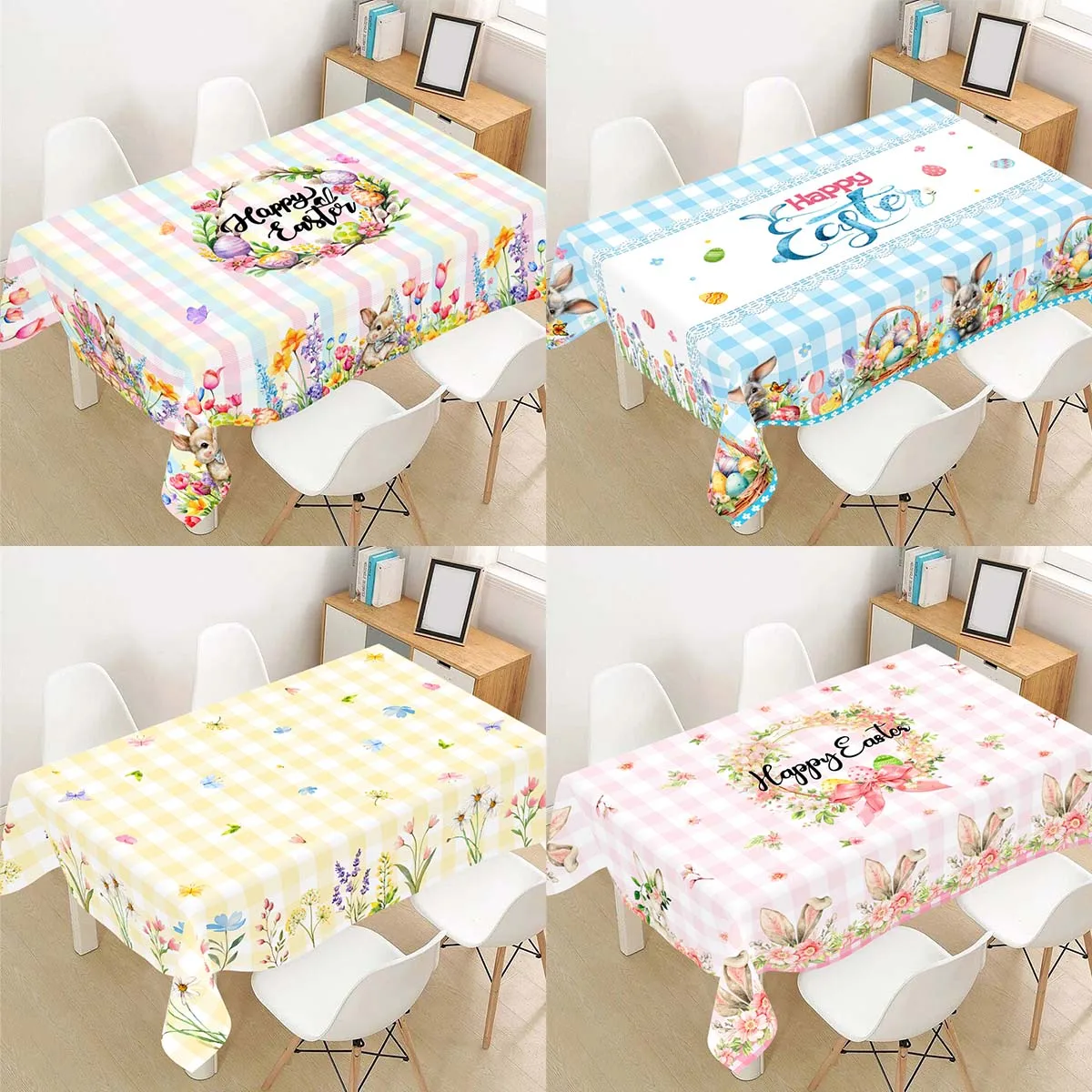 Vintage Easter Bunny Eggs Plaid Disposable Tablecloth Easter Decorations Spring Floral Rectangle Tab...