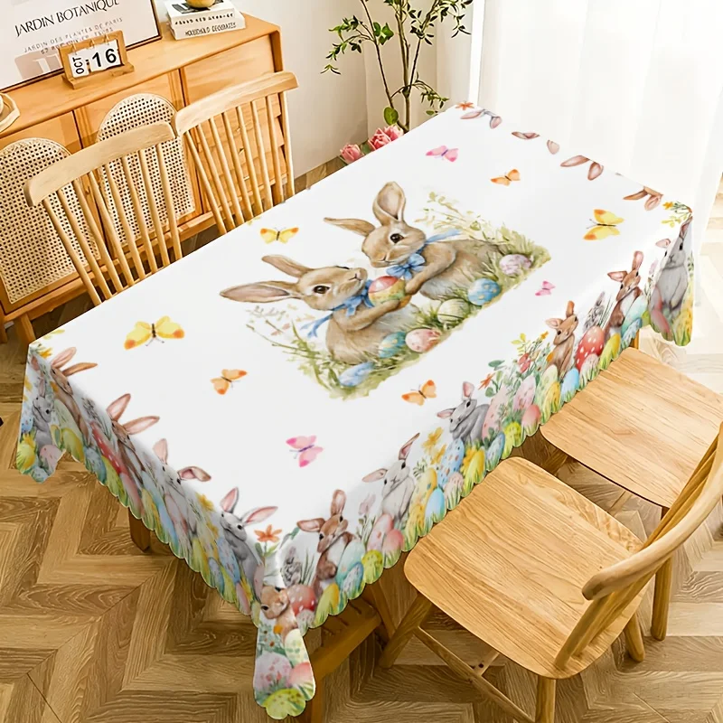 Easter Bunny Tablecloth Polyester Rabbit Eggs Flower Table Cover Ha...