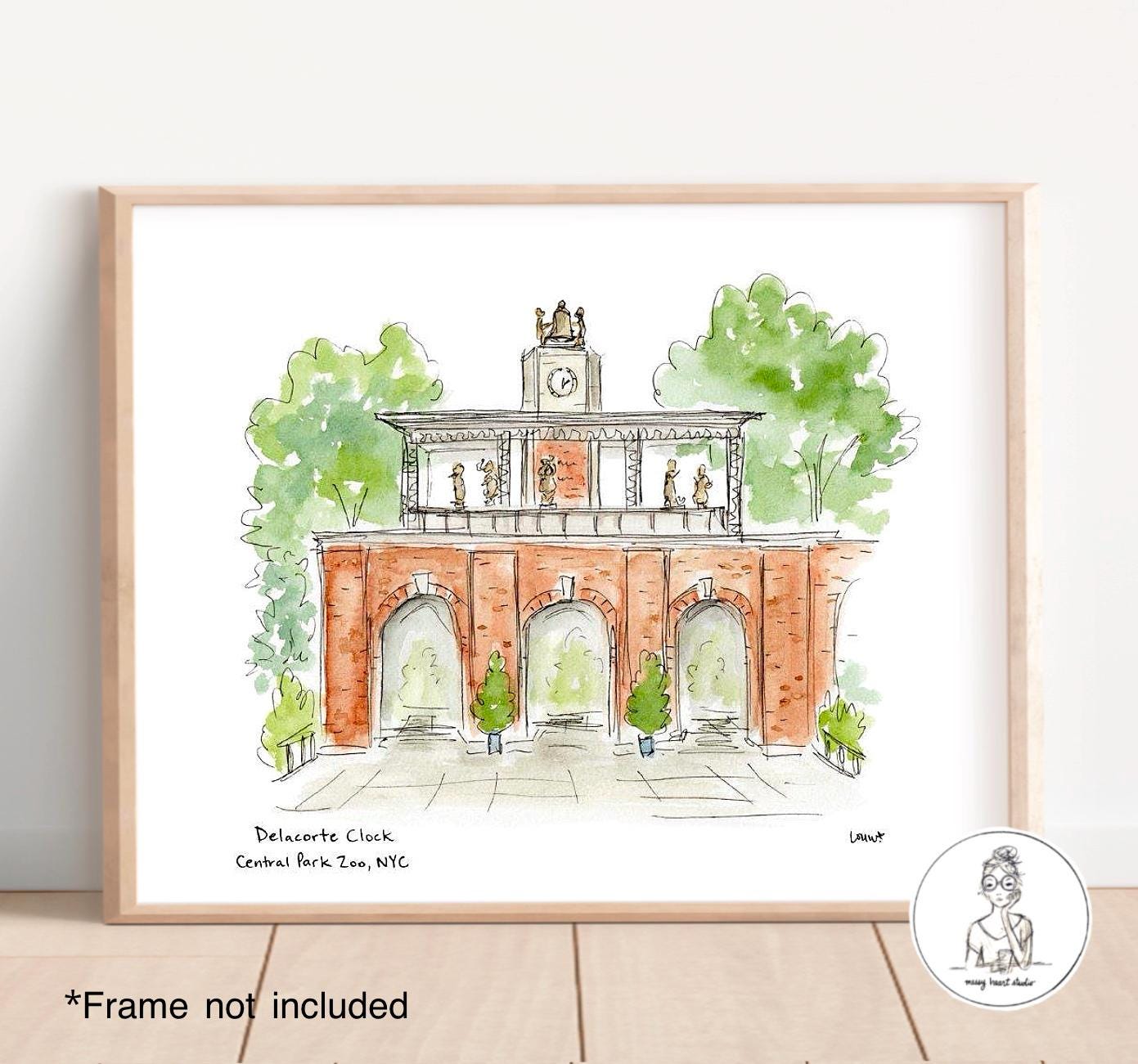 Delacorte Clock, Central Park Zoo, New York City, Watercolor & Ink Illustration. NYC Art Waterco...