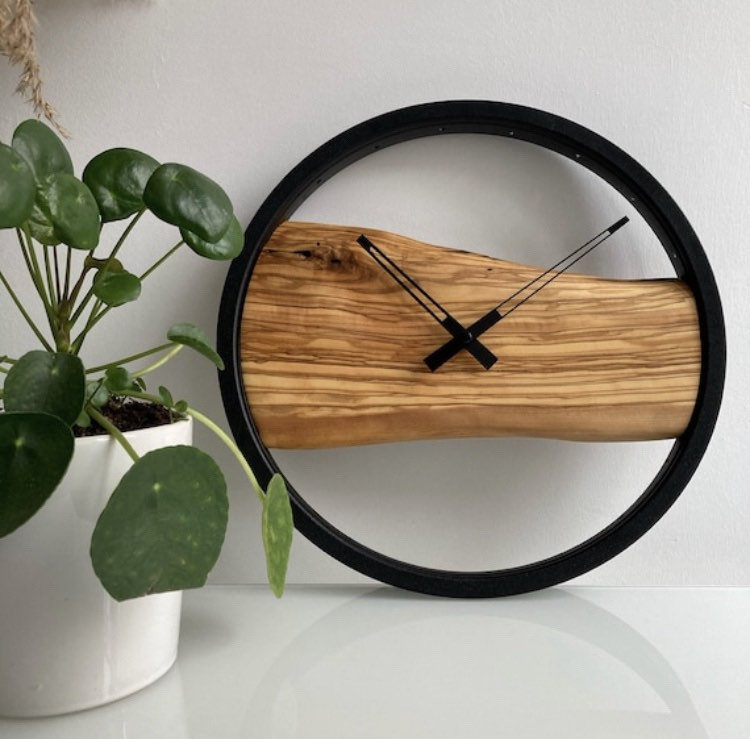 Designed using reclaimed olive wood and a bicycle rim, our wall clock has a unique pattern and textu...