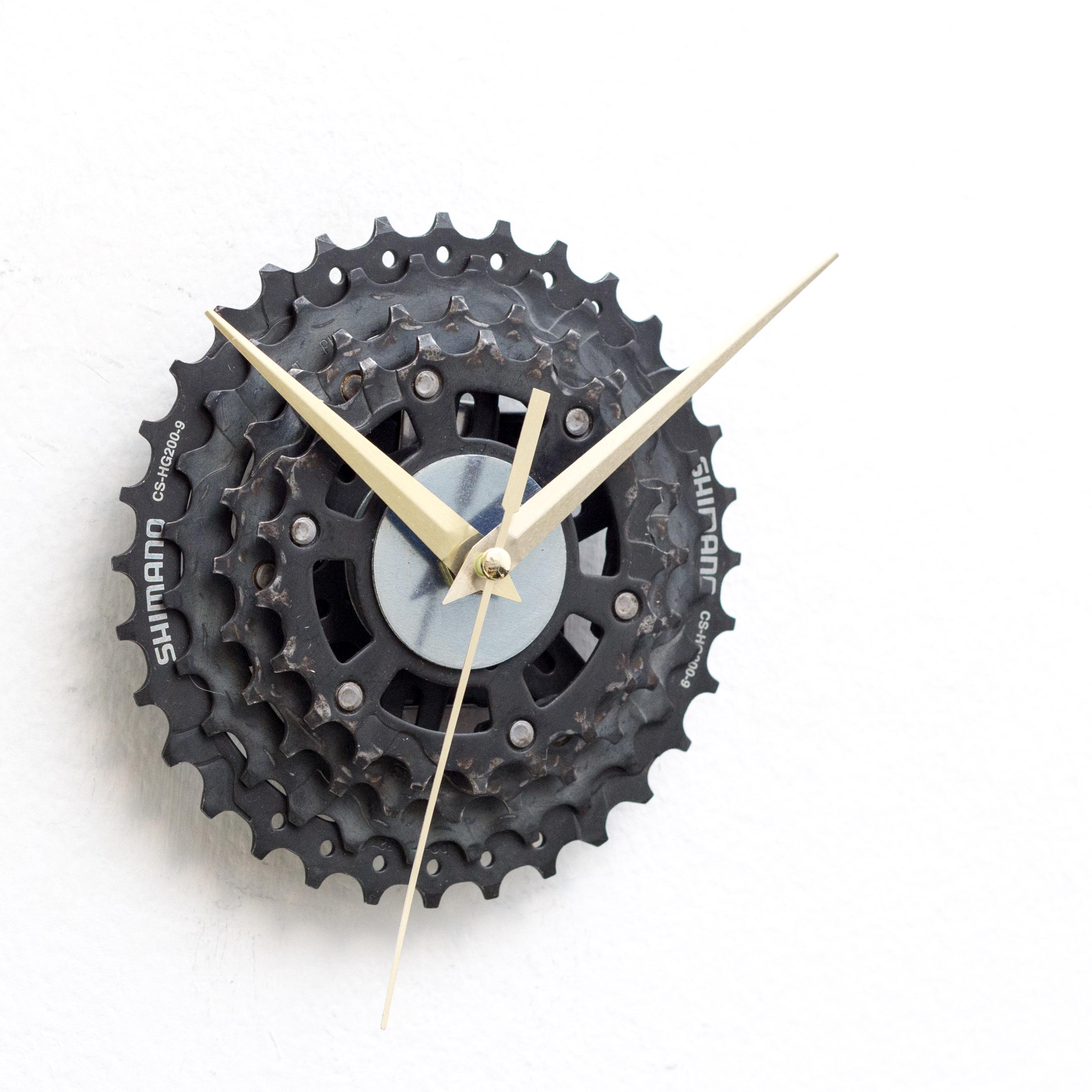 "This is a unique bike wall clock made out of recycled bicycle sprockets. Black clock hands mak...