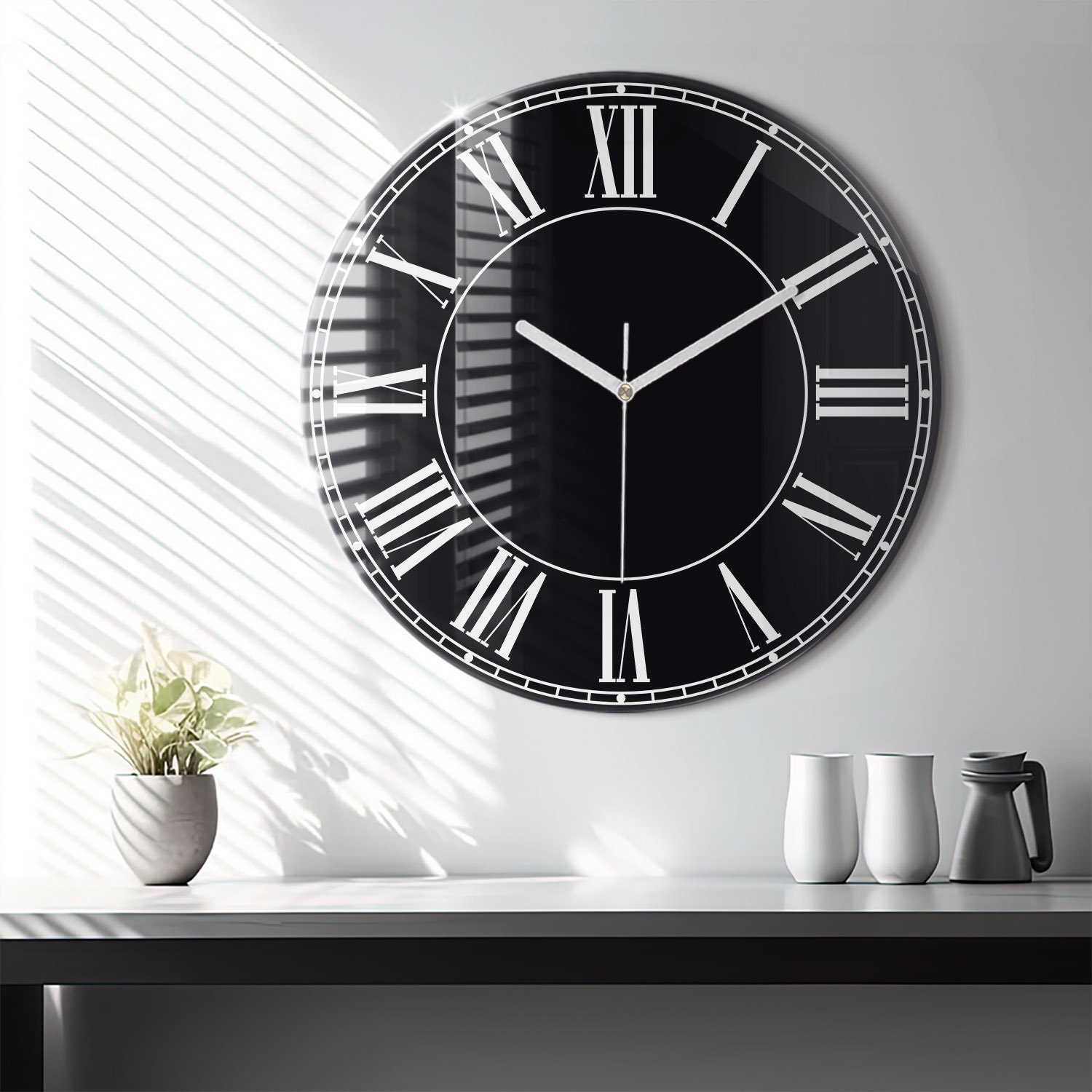 Roman Numbers Glass Clock, Black Modern Wall Clock, Unique Wall Clo...