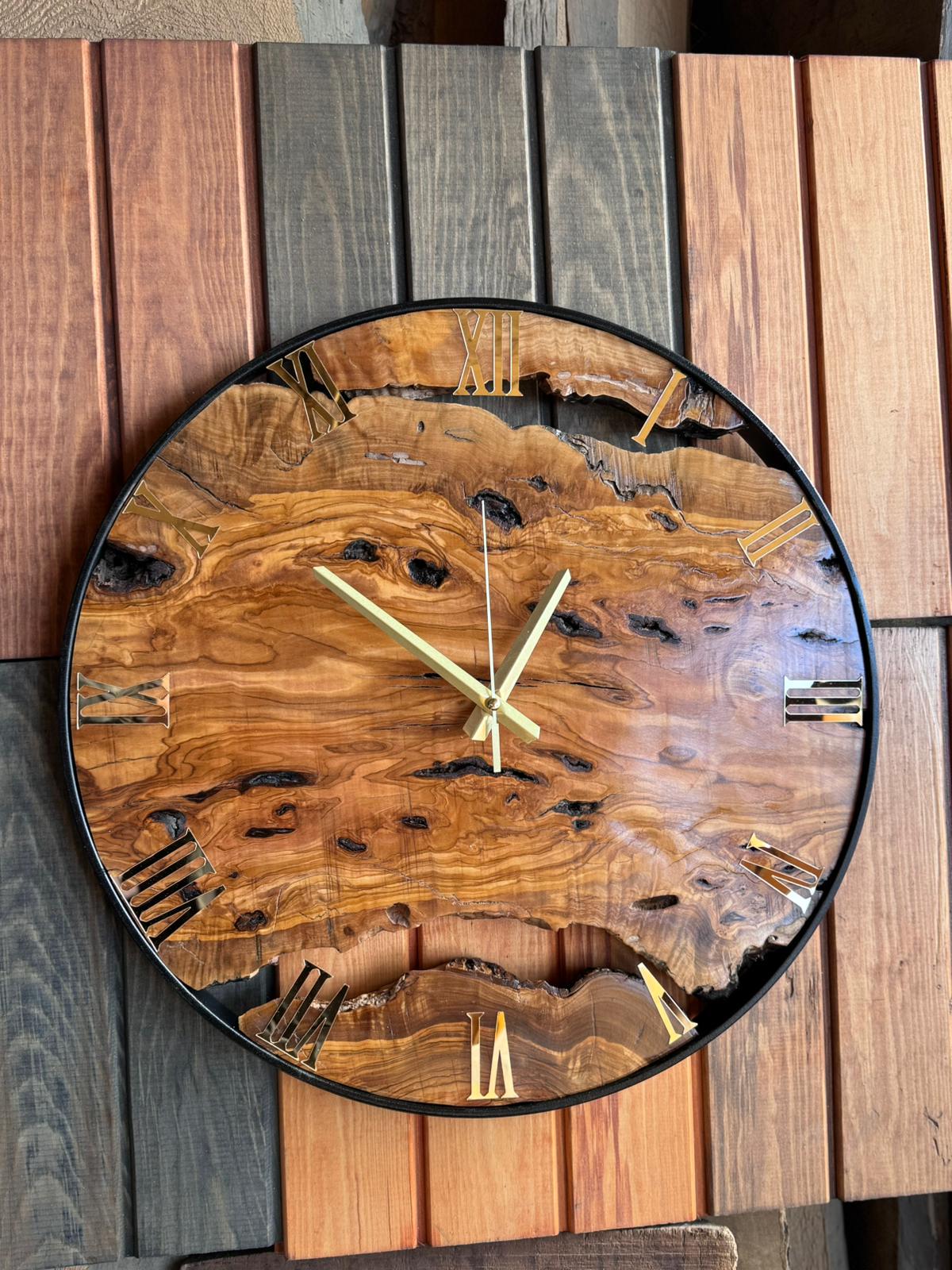 Wood Clock Made of Olive Wood, Metal and Olive Wood Wall Clock, Oli...