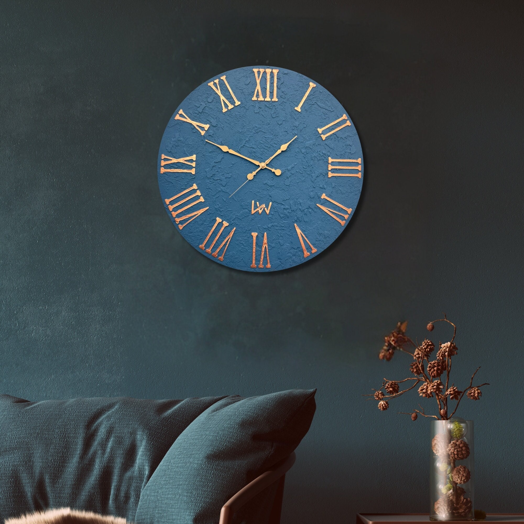 Unique Handmade Textured Wall Clock with Italian Travertine, Blue H...