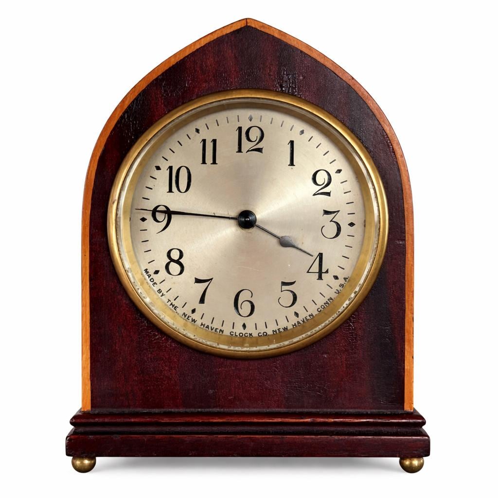 Vintage New Haven mantel clock with an arched wood case and silvered dial. Classic heirloom dé...